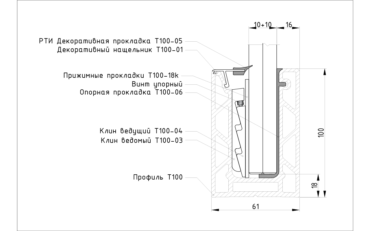 Системы зажимных алюминиевых профилей т100 предназначены для 8 типов размеров зажимаемых закаленных стекол: 10мм, 12мм, 16мм, 20мм, а также триплекса 5+5мм, 6+6мм, 8+8мм, 10+10мм