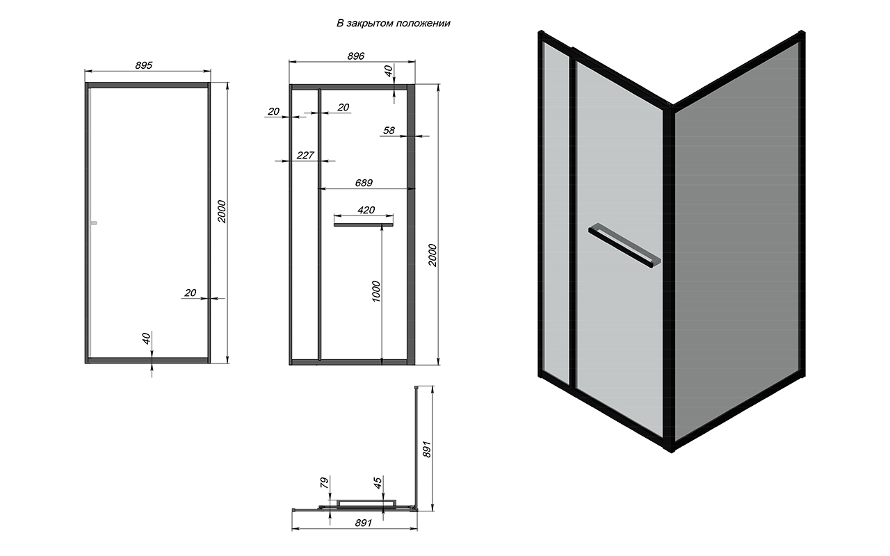 Комплект душевой с внутренней подвижной дверью, толщина стекла 8мм, 900х900х2000, aisi 304, полированная t470 PSS
