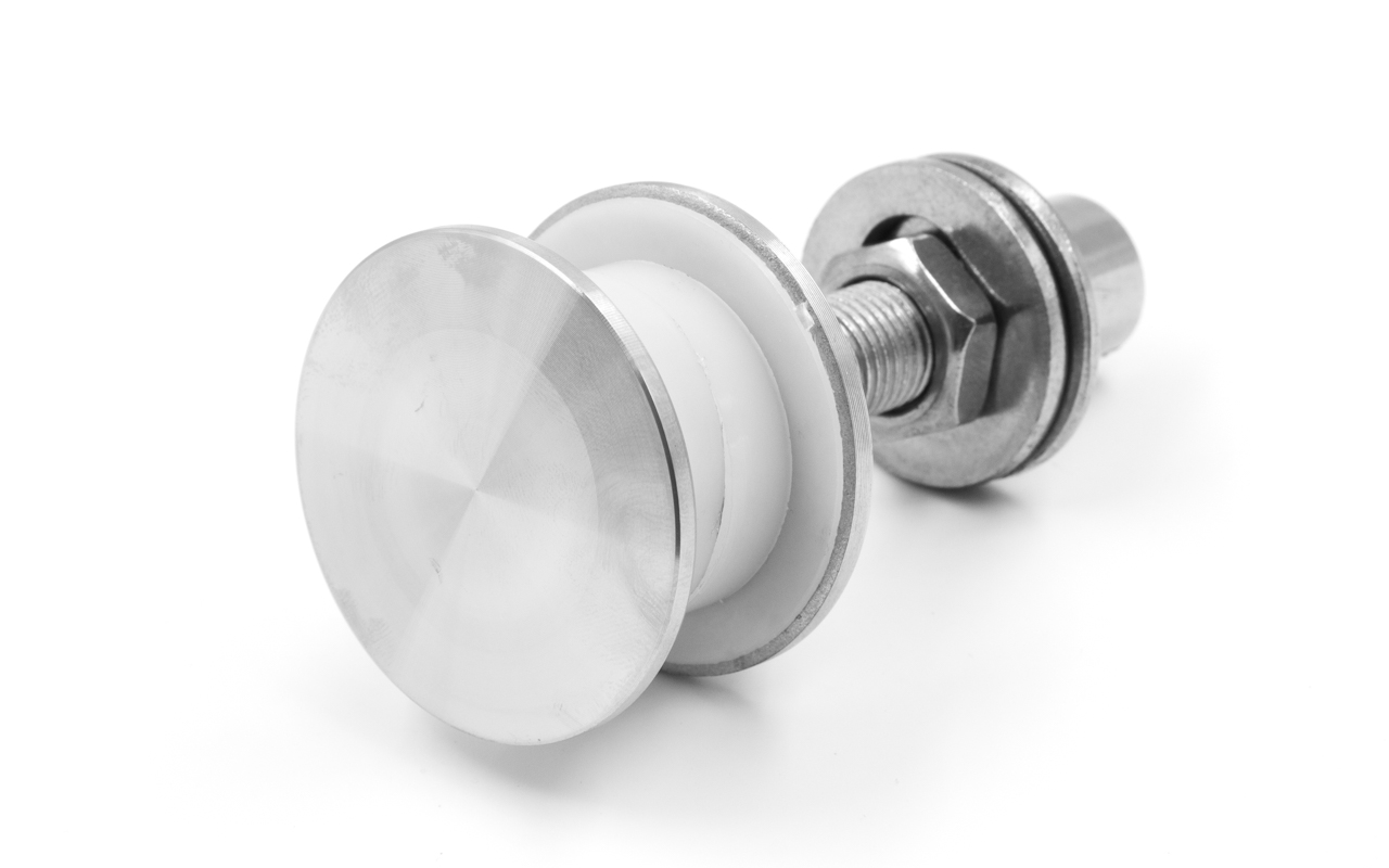 Рутель для вантового крепления козырьков, регулируемый, разборный, под стекло от 10 до 28 мм, полированный, диаметр внешнего кольца 52, шпилька М14. Марка стали - AISI 304