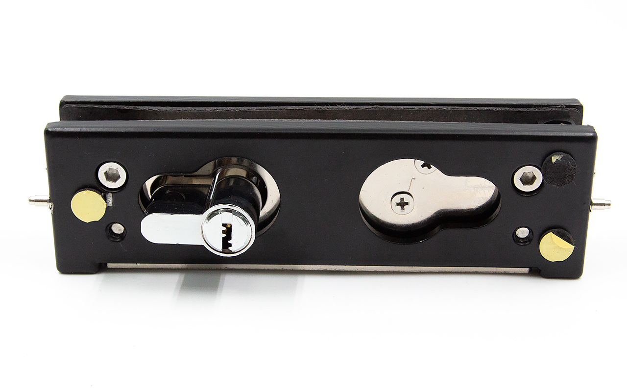 Сбоку нажимаем на крепления крышек и снимаем. Отвинчиваем винты, и фиксируем замок в подготовленный вырез в стекле. Далее закручиваем и фиксируем обратно крышки. Ответную часть крепим под замком с пробуренным отверстием под ригель.