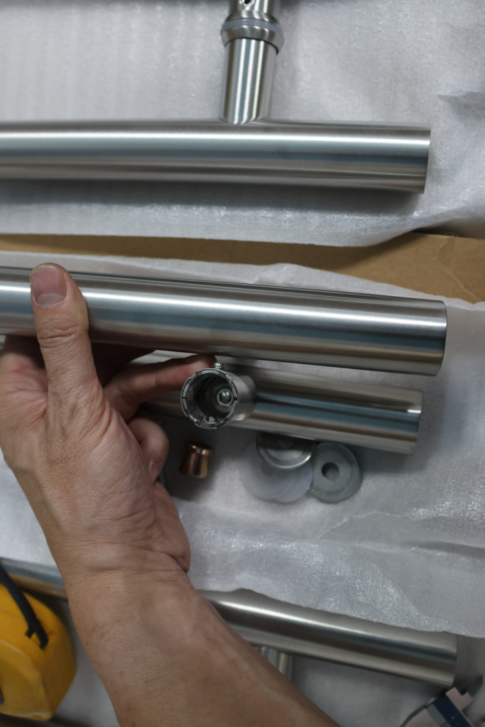 у основания ручки откручиваем с помощью шестигранника винты, делим ручку на две части, в заранее заготовленные отверстия вырезы в стекле 10-12 мм фиксируем первую часть ручки в отверстиях и с обратной стороны ответную часть затягиваем с помощью шестигранника