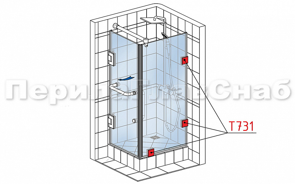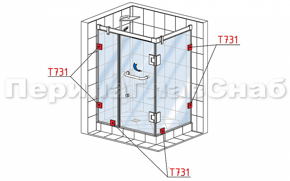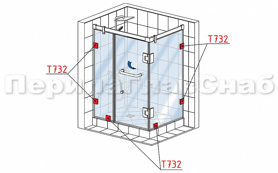 Коннектор разбирается на две половинки, Г-образной стороной крепится к стене на саморезы. Затем к нему прикладывается стекло с заранее заготовленным вырезом согласно чертежу, а далее второй половинкой стекло зажимается.