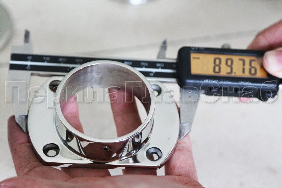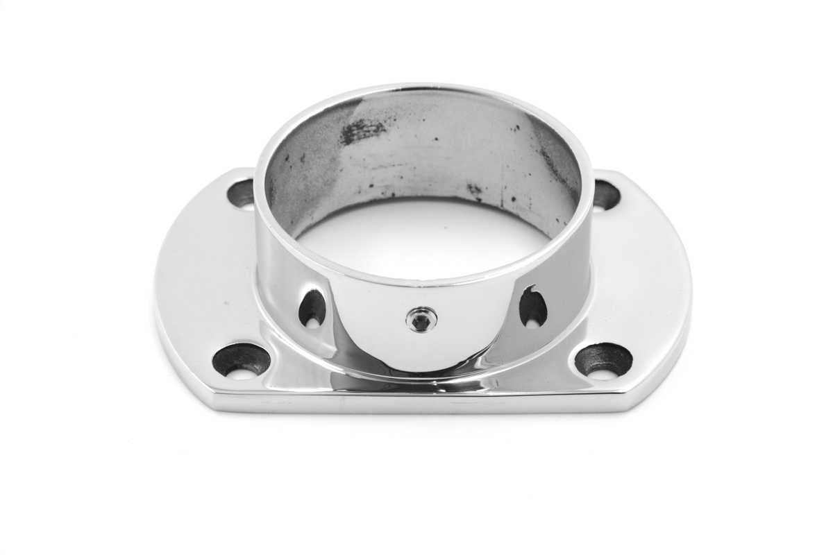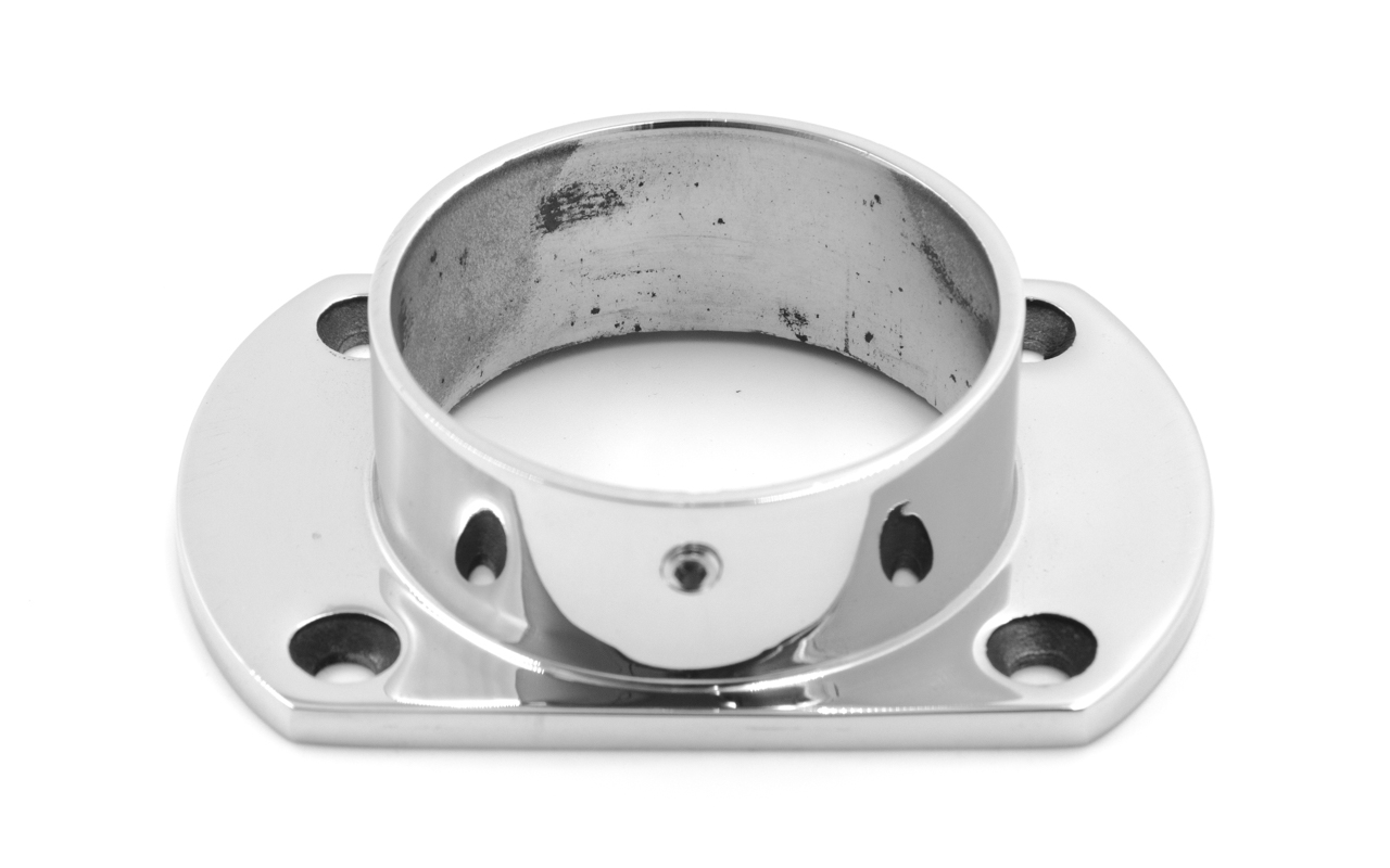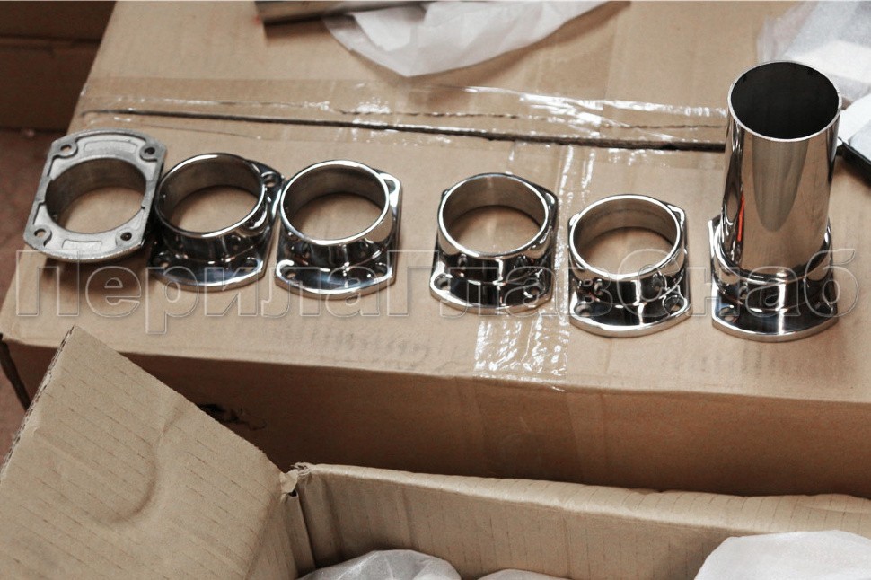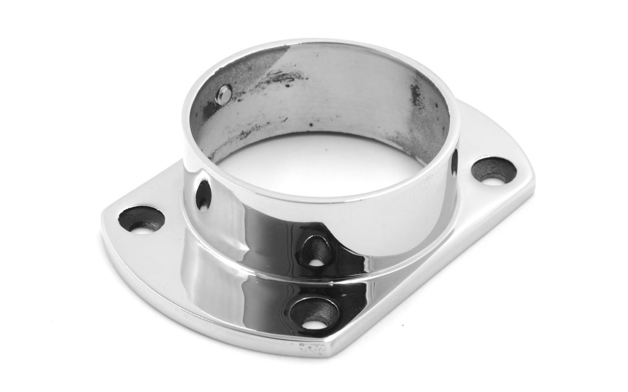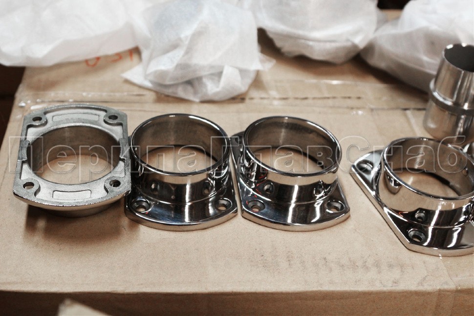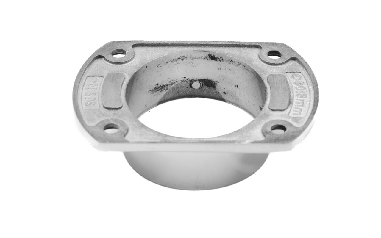 Фланец укороченный, литой, полированный. Деталь с четырьмя отверстиями для трубы диаметром 50.8 мм. Марка стали- AISI 304