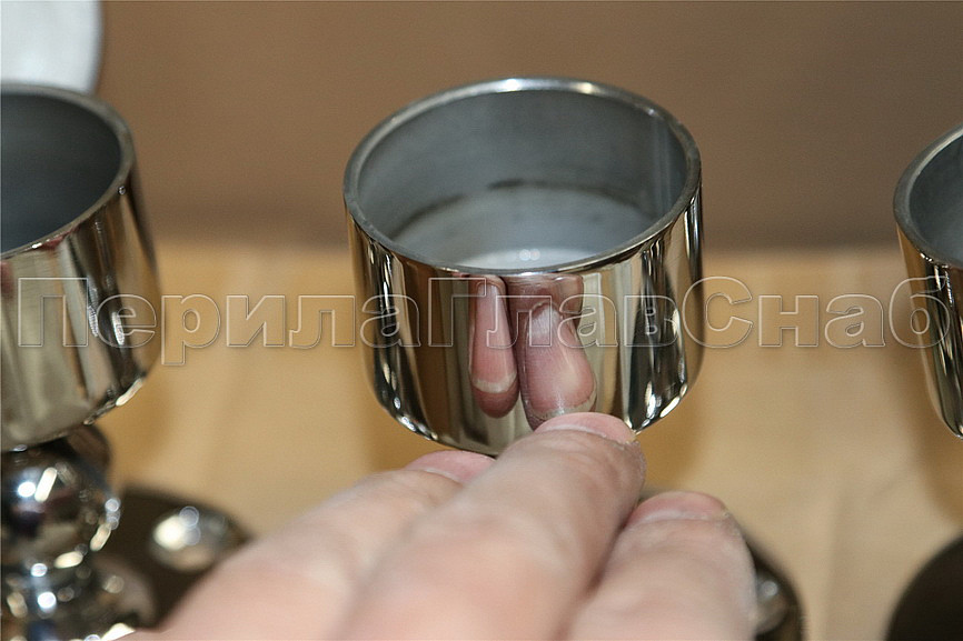Фланец наружный по отношению к трубе поручня. Перила заправляются внутрь стального фланца, установленного на 3 самореза в стену.
