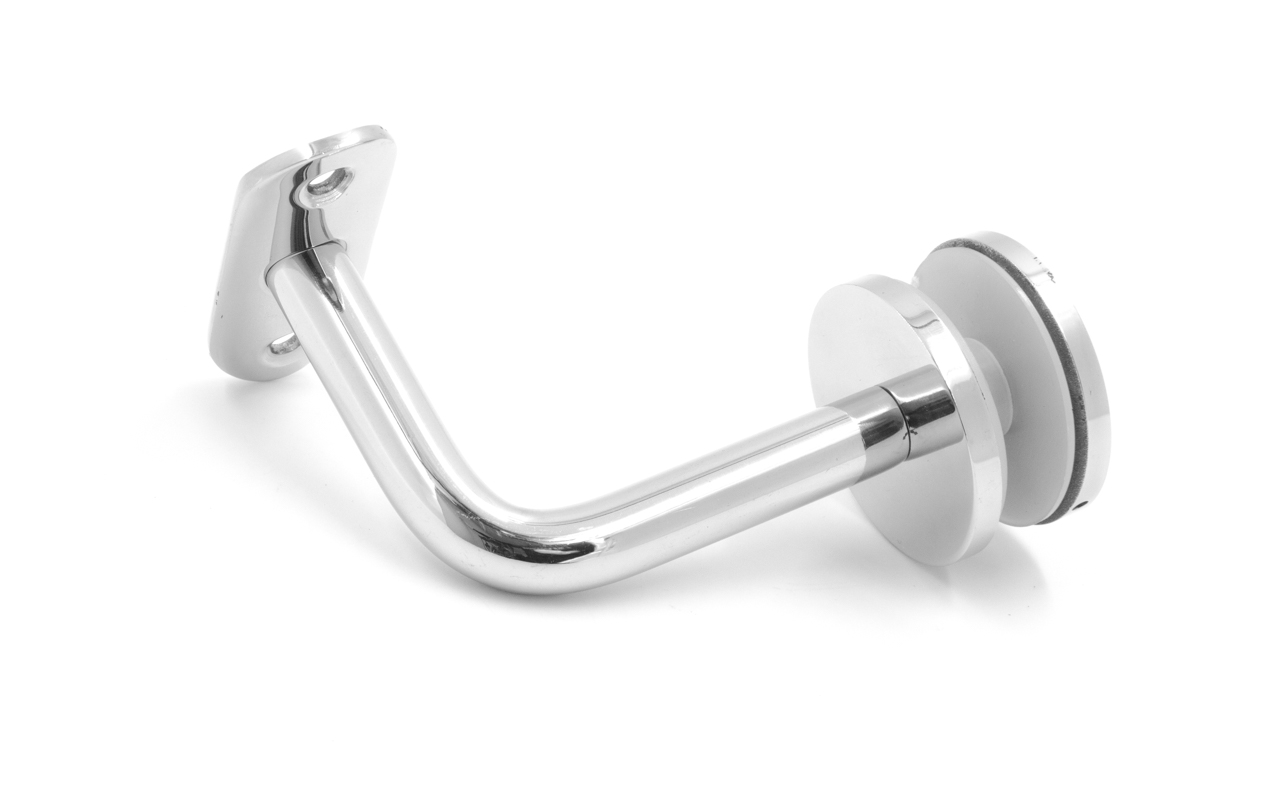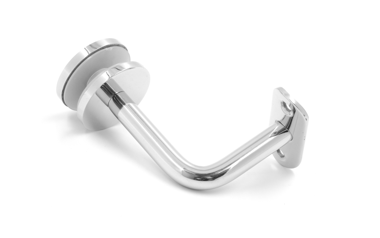 Для установки бокового держателя в стекле сверлится отверстие Ø17 мм, затем пристенок фиксируется затяжной гайкой в торце фланца. А сам поручень приваривается к загнутому наконечнику фитинга.