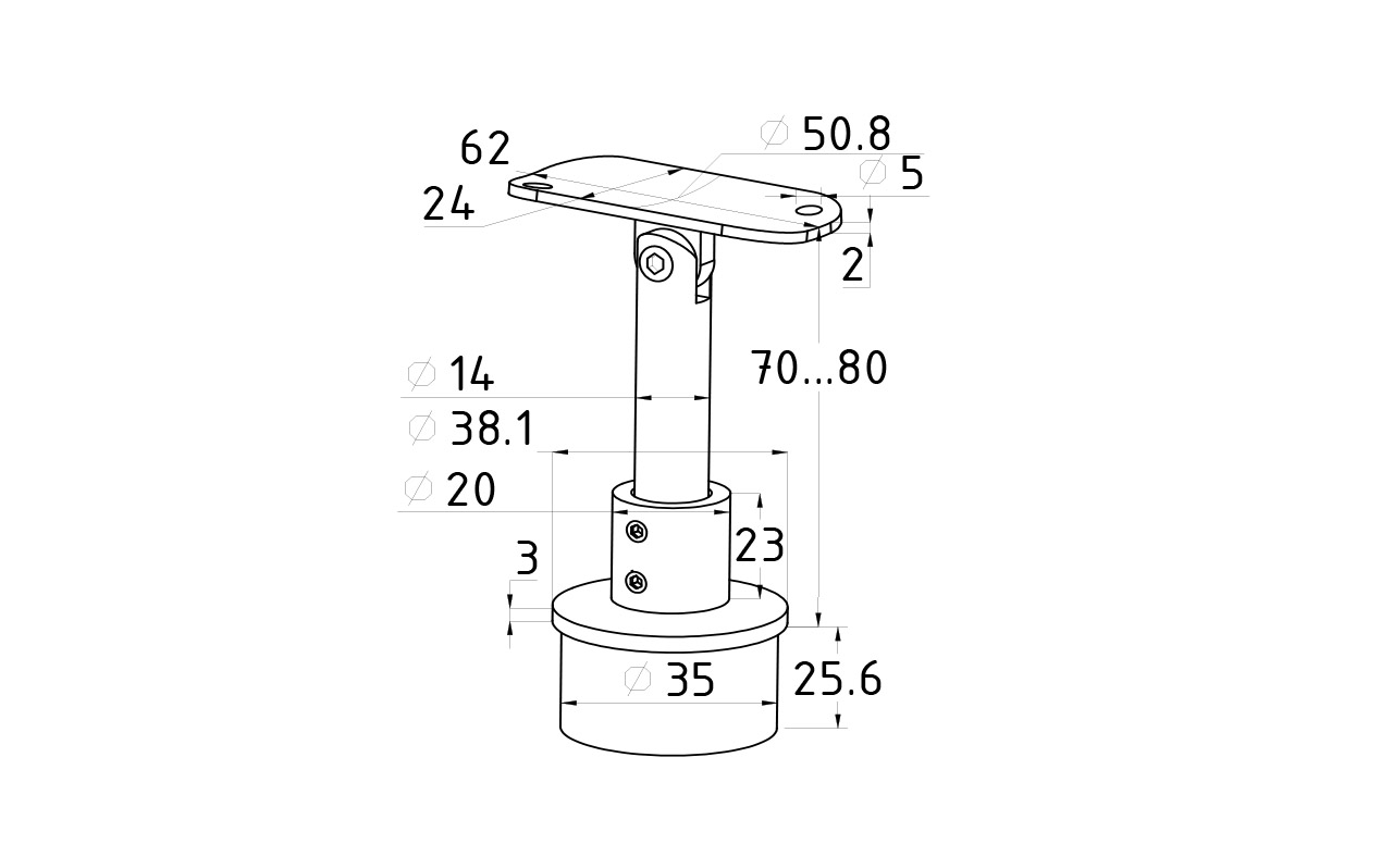 Наконечник регулируемый по высоте на стойку Ø38.1х1.5 мм, с регулируемым ложементом под поручень Ø50.8 мм. Наконечник литой, полированный, нержавеющий. Марка стали - AISI 304