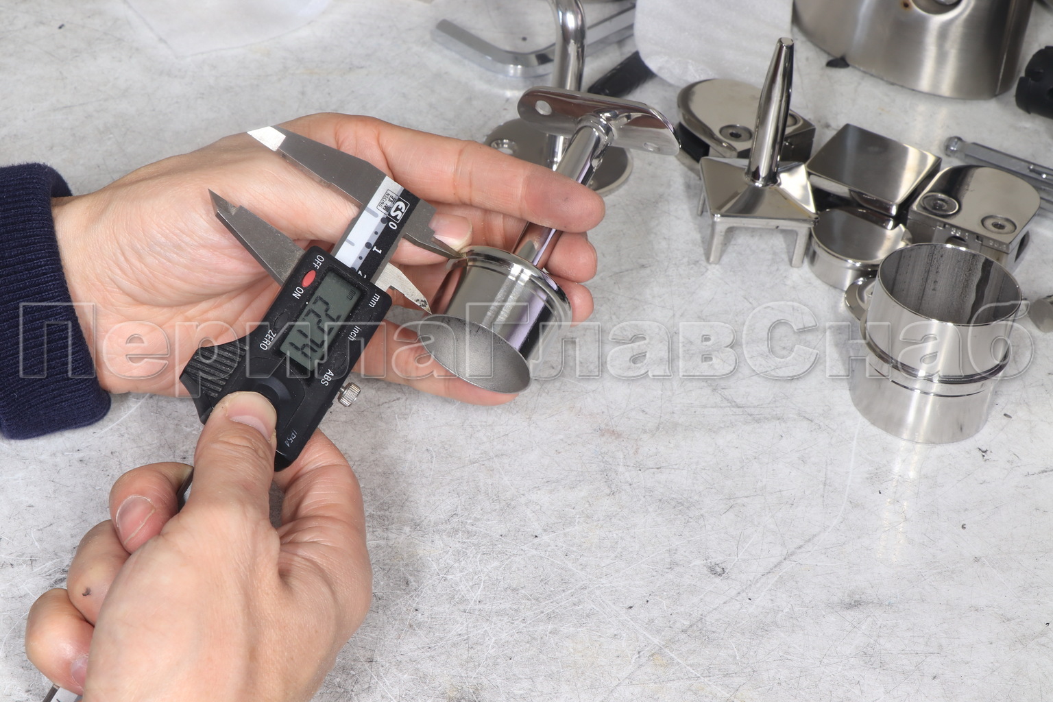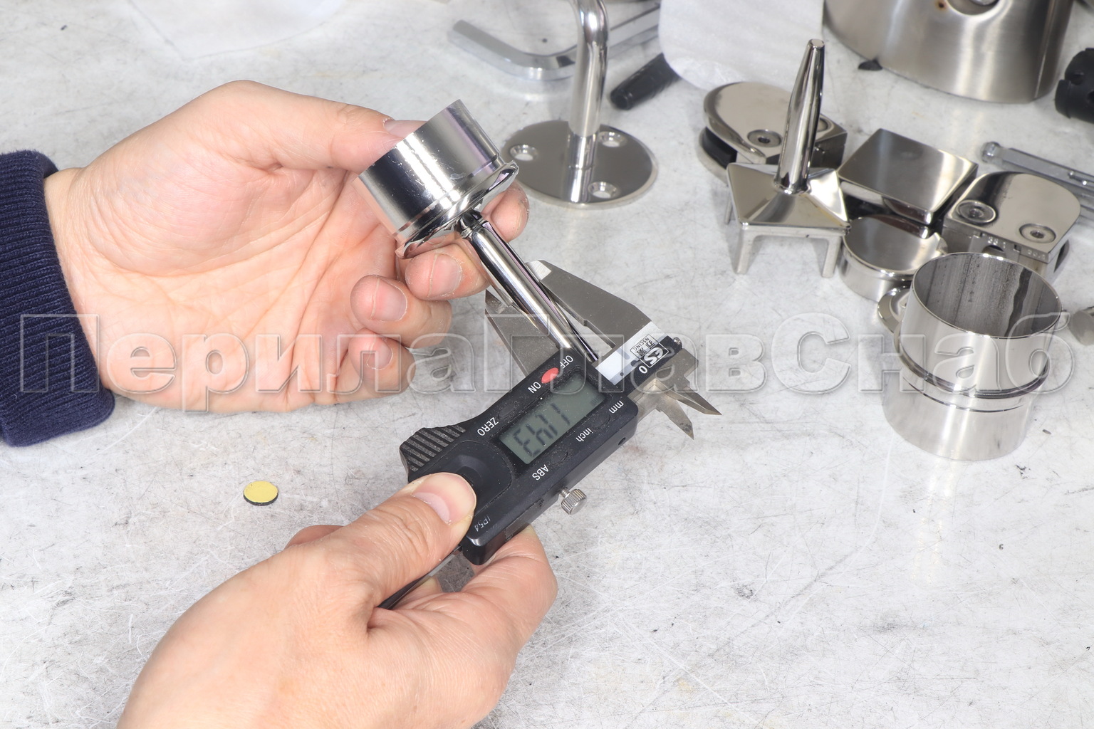 Наконечник палец на стойку Ø42.4х1.5 мм, с регулируемым ложементом под поручень Ø50.8 мм. Деталь литая, полированная, с повышенной коррозионной стойкости, нержавеющая. Марка стали - AISI 316
