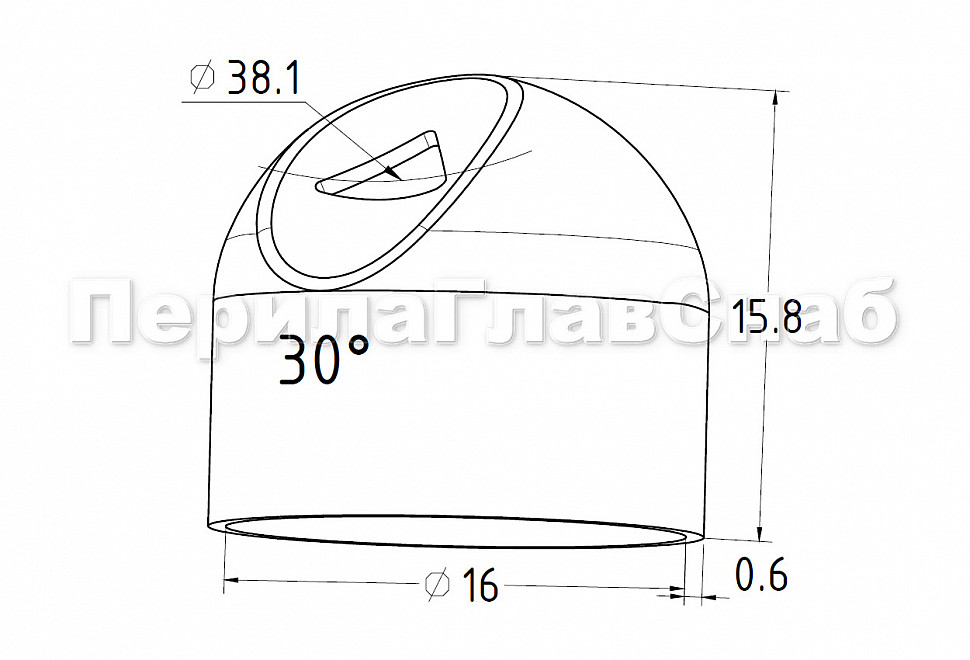 Наконечник штампованный (СПС) косой 30° на трубу Ø16 мм, для поручня Ø38.1 мм, полированный, нержавеющий, (AISI 201) k212-3
