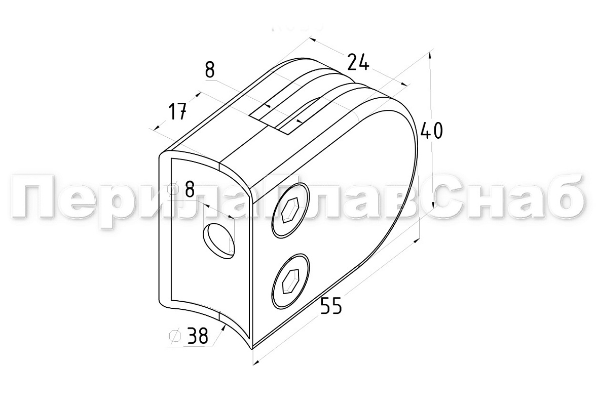 Стеклодержатель штампованный под стекло 8 мм (4+4 мм), под стойку Ø38.1 мм 40х24х55, полированный (AISI 304) k038