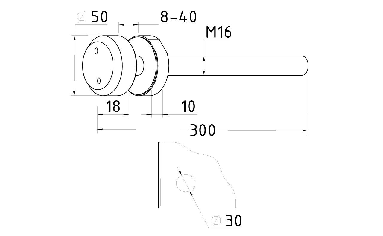 Стеклодержатель Ø50х10х18, шпилька М16х205 мм, для стекла 8-40 мм, AISI (201), с возможностью регулировки выноса до 65 мм, для торцевого крепления стекла, полированный, литой k277-3