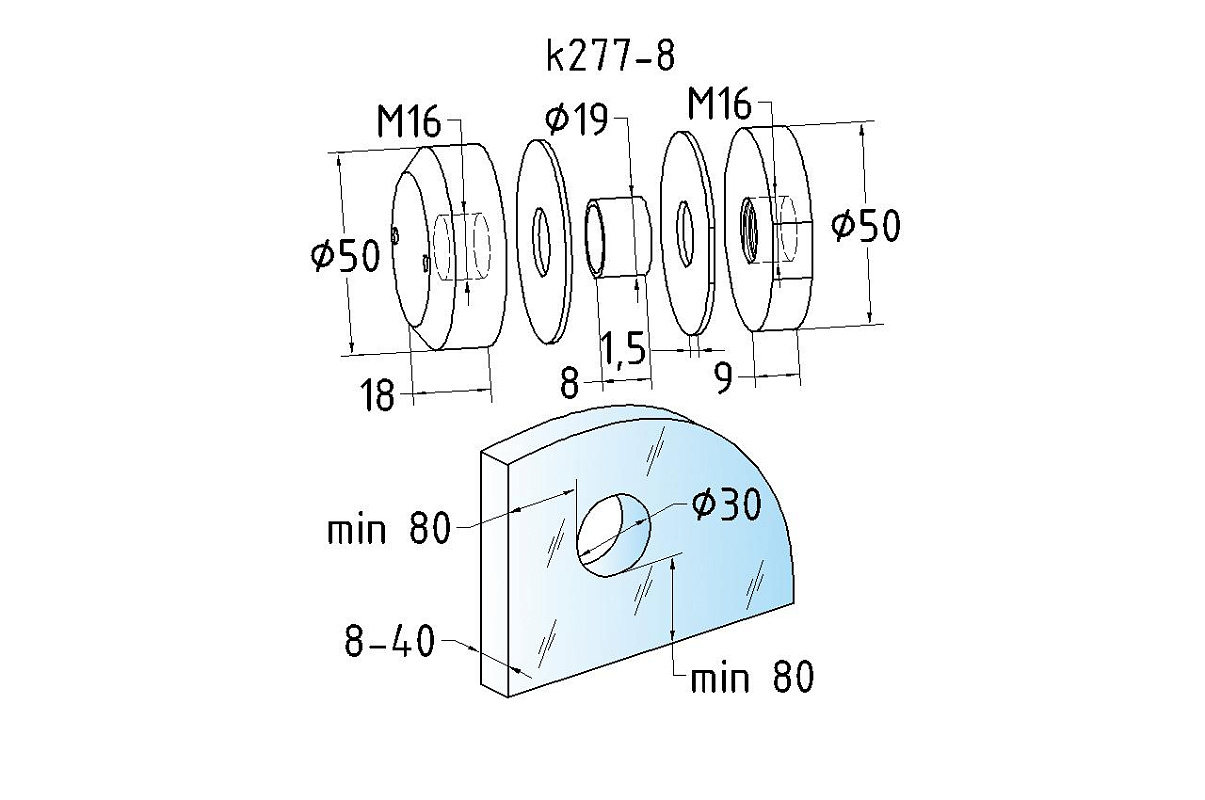 Мы рекомендуем делать отверстие в стекле 30 мм для более простого монтажа (для регулировки стекла в плоскостях). Так же вам может понадобиться эксцентрик для стекла Ф-0530.