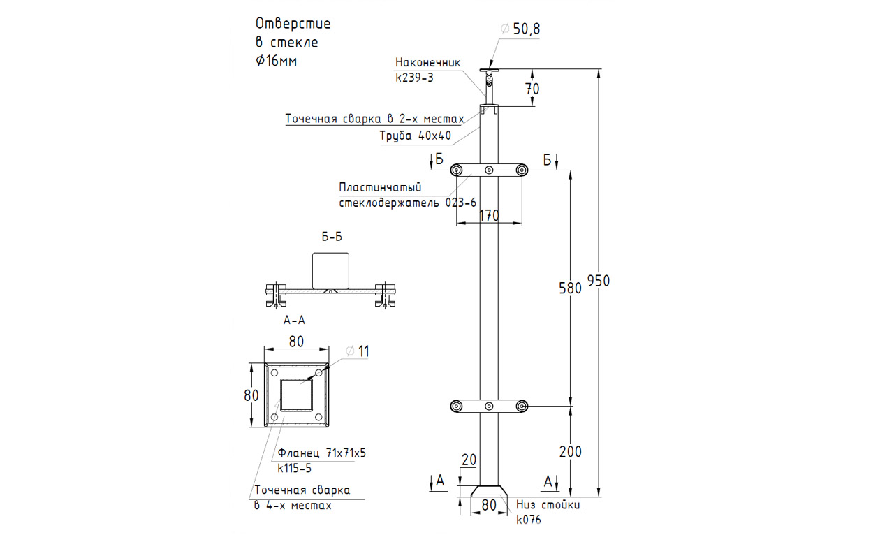 Стойка изготовлена на нашем производстве и готова к установке сразу после покупки. Используемая при изготовлении 304 марка стали позволяет применять данную стойку как внутри здания, так и на улице. Особенно это важно для людей, которым важно сделать свои ограждения в одном стиле как внутри здания, так и снаружи. Все элементы стойки приварены аргонной сваркой, благодаря чему фланец с 4-мя отверстиями для крепления в пол, ригеледержатели под трубу ф16мм и наконечник под трубу ф38-50, либо под профильную трубу составляют единую конструкцию со стойкой. Сварные швы на балясине убраны и идеально заполированы,а балясина ничем не уступает ограждениям сделанным профессиональными бригадами. Любой человек сможет сделать монтаж имея только отвертку, клей( Ф-1127, Ф-1105) и саморезы ( М-3850, М-3847, М-3215). Особенность данной балясины в использовании профильной трубы, за счет которой можно подчеркнуть строгий стиль. Ищете что вам подойдет под стиль Хай-тек, берите данную стойку. Стойки с пластинчатыми стеклодержателями используют, когда хотят сделать цельное ограждение за счет стекла. За счет целостности стекла, ограждение создает ветровую заслонку как щит и ваши посетители не будут переживать за ветровые порывы. Ограждение сданными стойками хорошо подходит для балконов, ресторанов на крыше и открытых кафе. Используемые в стойке пластинчатые стеклодержатели дают широкий спектр использования стекла толщиной от 6 до 12мм. Стекло может быть прозрачным, матовым, бронзовым, с рисунком и т.п. ( С-8003; С-8023; С-8056; С-8022; С-8058). Для монтажа стойки Вам потребуется клей (Ф-1127, Ф-1105), саморезы (М-3850, М-3215), шестигранник ( k931, k932) и отвертка.