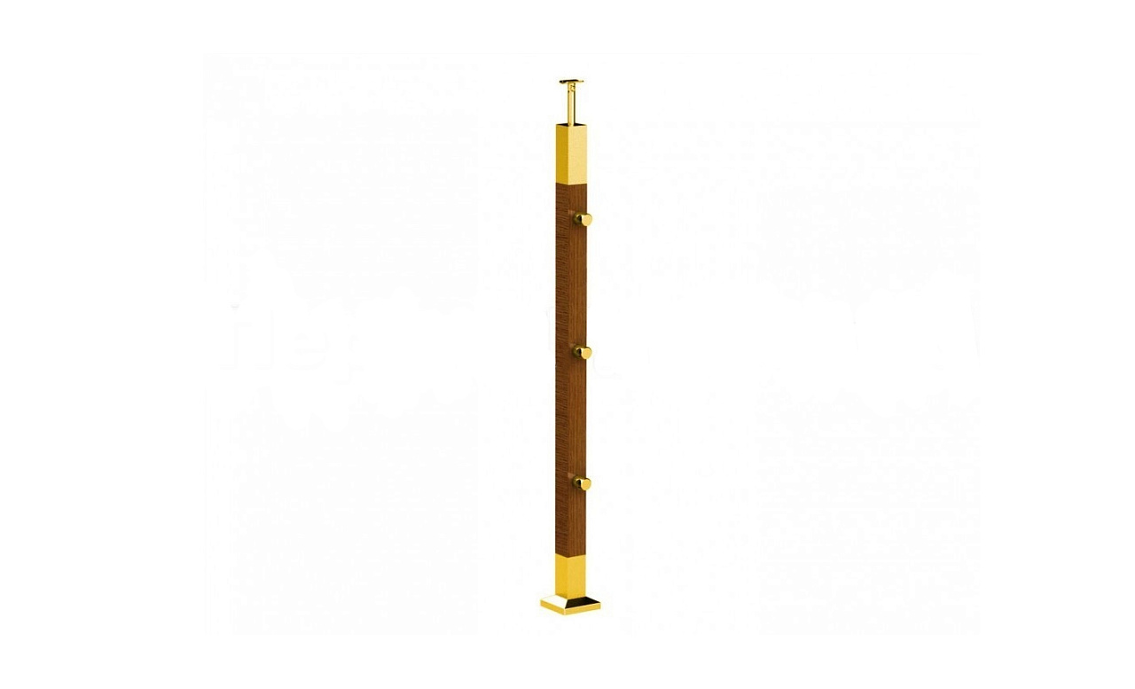 Готовая стойка 40х40х950 мм, деревянная, со вставками из нержавеющей стали 2х100 мм с 2 пластинчатыми стеклодержателями, под золото k740-2-G купить в Красноярске