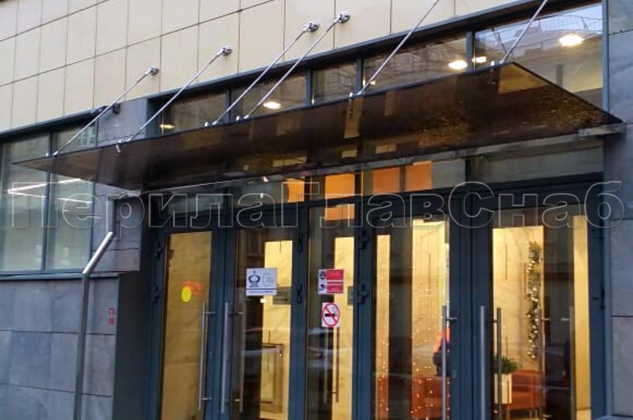 Что повлекло за собой немедленную потребность в защите входных групп от атмосферных осадков в виде стеклянных козырьков. По заданию заказчика было разработано и воплощено в жизнь сложное конструктивное решение. Срок выполнения работ составил двадцать пять рабочих дней. Наша компания установила под ключ четыре козырька разного размера. Общая площадь составила более двадцати семи квадратных метров. Стоимость кв. метра 76 758,00 руб. В данной работе использован многолетний опыт и нестандартный подход инженеров-конструкторов нашей компании, было применено и реализовано следующее уникальное решение: контор уклон козырьков к стене, это значит, что при дожде вода будет скатываться по стеклянной поверхности в сторону стены и далее попадет в водоотвод (специально для зимних условий мы поместили нагревательный элемент в водоотводную систему, что позволило не собираться снежным шапкам на наших козырьках, тем самым снизили нагрузку на стекло в снегопады). Еще одну нестандартную особенность нам пришлось исполнить, если верхнее крепление козырьков стандартное для отрасли (вантовое), то нижний крепеж необходимо было размещать на витражах входных групп со специальным креплением в профиле самого витража, что -бы достичь оптимальной высоты козырьков над головой гостей и сотрудников БЦ. В данной работе применили закаленное стекло триплекс 8+1+8 мм тонированное в массе бронзового цвета.  Все нержавеющие элементы - составляющие детали козырька собственного производства и аналогов по качеству на рынке нет.