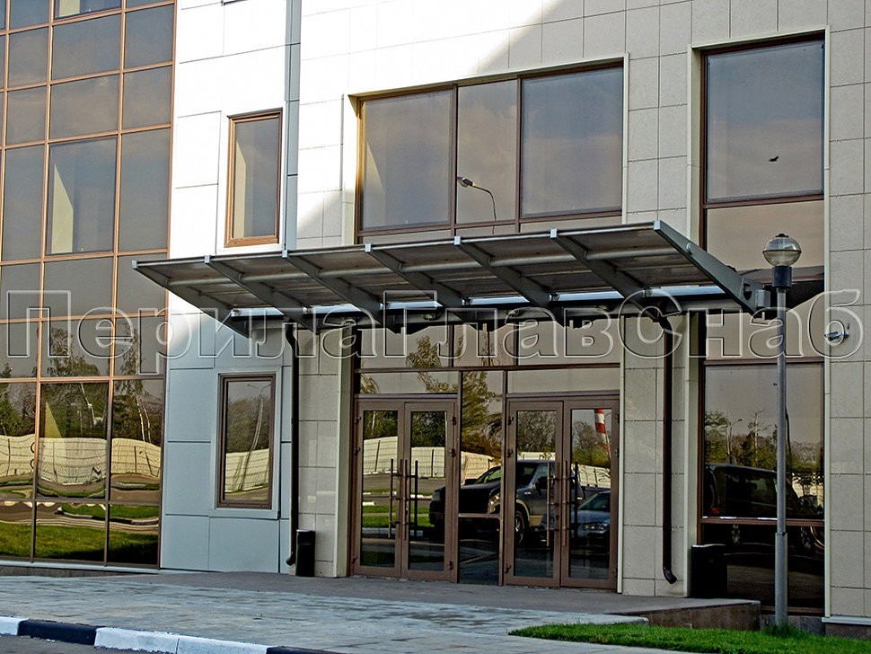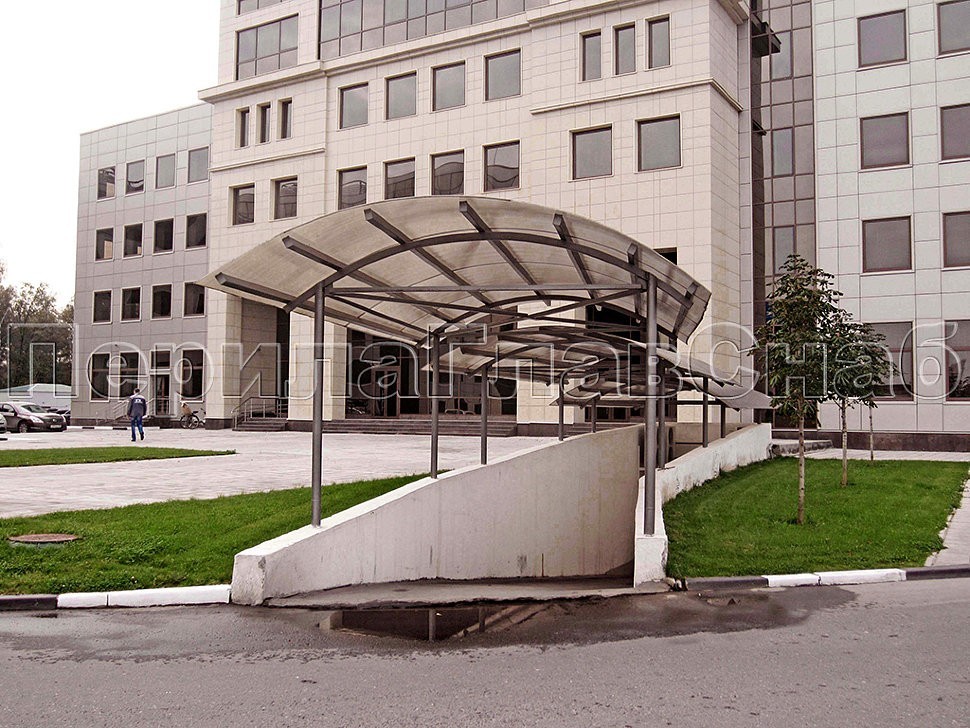 В нескольких местах были установлены односкатные и полусферические козырьки. На входе по стилю подошел больше козырек с опорами из нержавеющей стали в форме трапеций. А на выезде из подземных технических помещений установлены более простые круглые опоры.