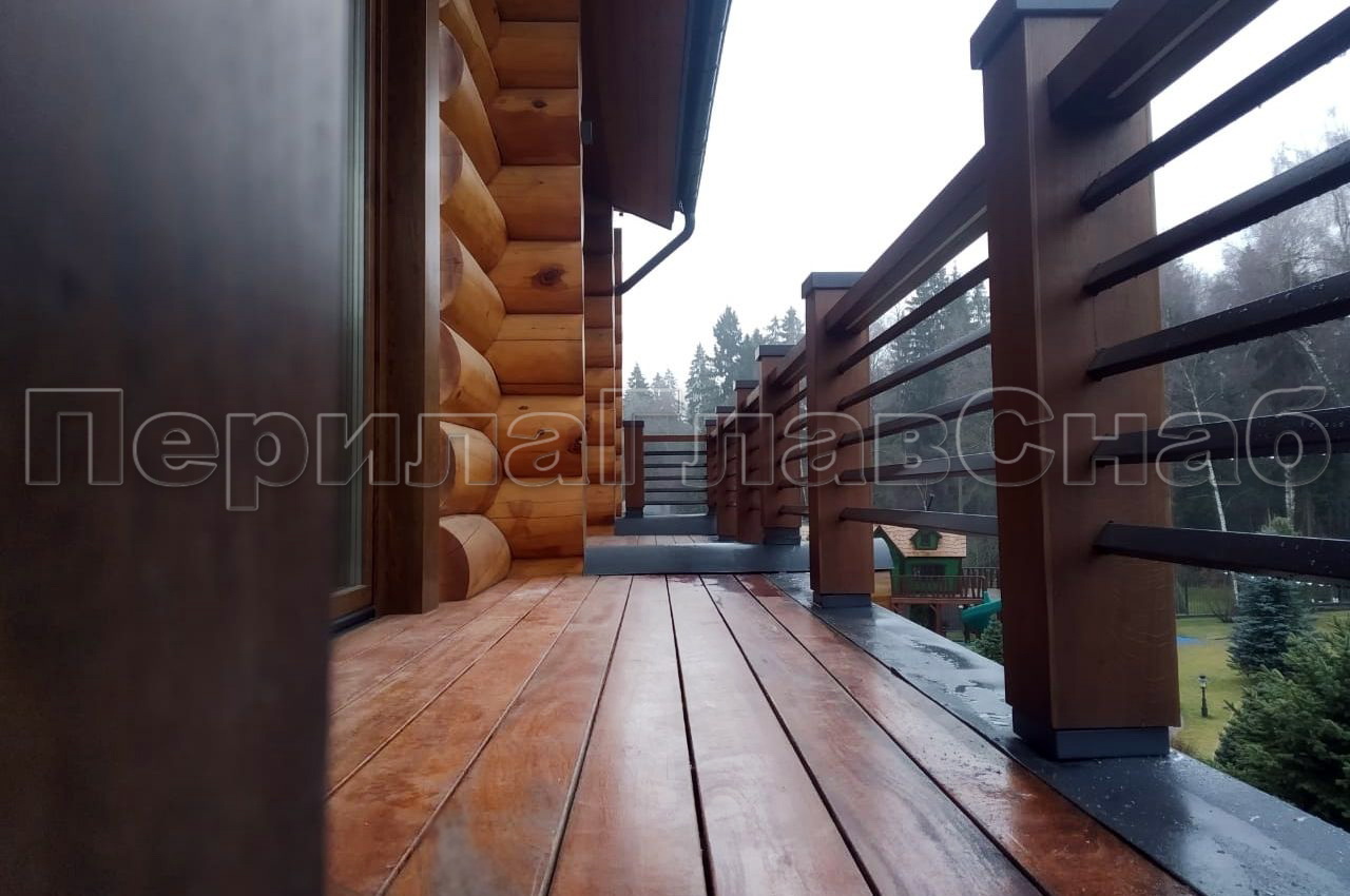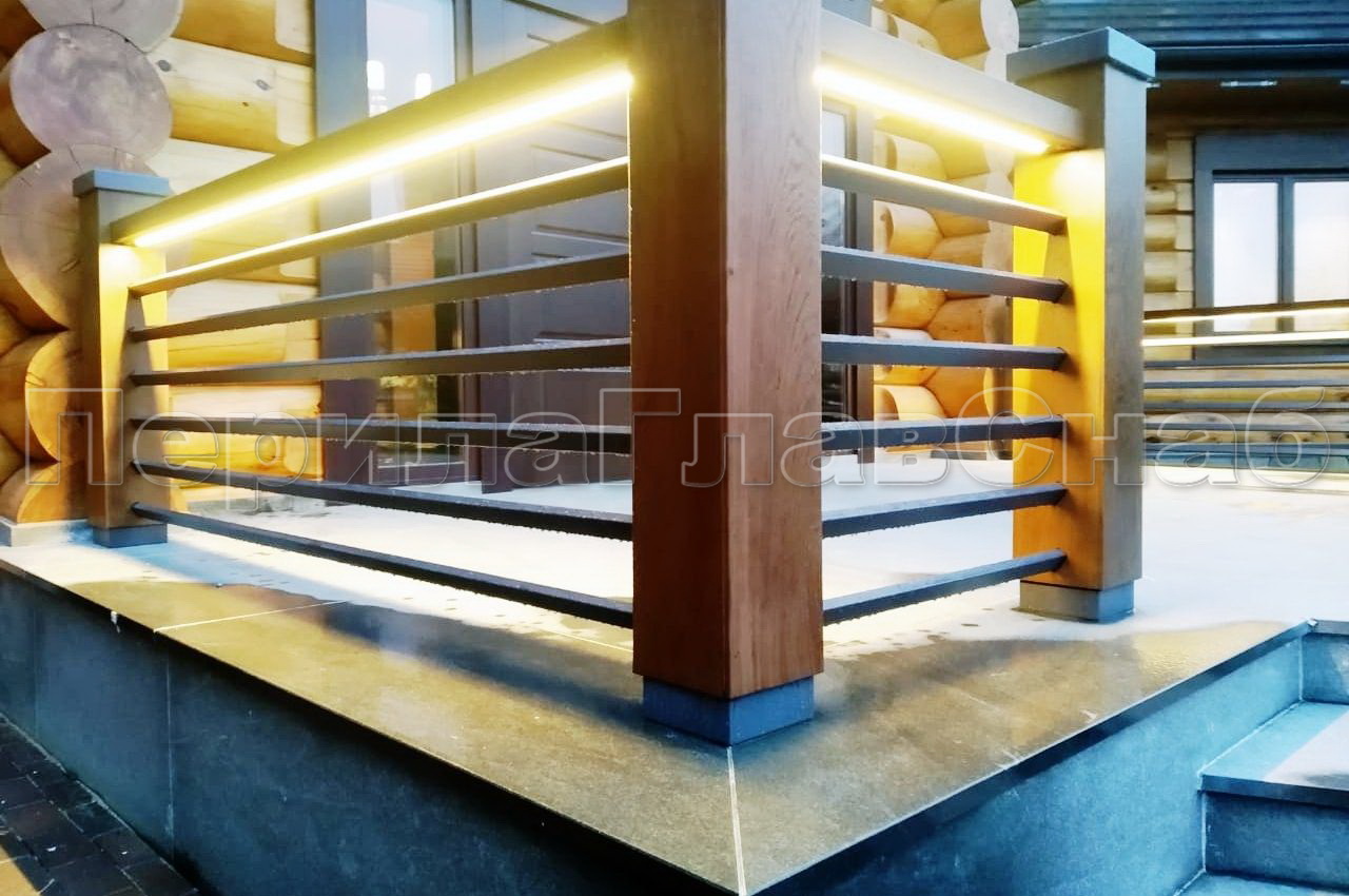 Разработку проекта вели менеджеры и инженеры компании. Команда проделала работу по согласованию сложных конструктивных моментов. Согласование по входной группе включало в себя геодезию черновой отделки входной группы с разработкой чертежей для согласования монтажной схемы перед установкой теплого пола. После установки мраморного чистового пола была сделана финальная геодезия для последующего согласования разметки установки ограждения. Стойка из нержавеющей стали 100х100х3 мм с креплением на фланец через анкерный держатель, 6 ригелей 40х60х2 мм, ригеля устанавливаются не в горизонтальной плоскости, со смещением внутрь стойки для рассеивания света из поручня. Верхняя и нижняя крышки стоек сделаны из нержавеющей стали. Крышки закрывают внутренние крепежные элементы и защищают столбы от попадания влаги.  Деревянный поручень 120х60 мм с фрезерованным пазом под подсветку и готовыми посадочными местами к основной стойке. Подсветка монтируется в защитном коробе и защищена от влаги. Облицовка стоек из влагостойкого дерева выполняет функцию позиционирования наклона ригелей, путем фрезеровки отверстий по заданным координатам, что позволило добиться одинакового расположения ригелей. Цвет подобран по образцу предоставленным заказчиком. Собственного производства все нержавеющие элементы конструкции AISI 304 покрыты порошковым покрытием по каталогу RAL. Стоимость изготовления и монтажа за метр погонный составила 112 915 руб. Согласование по ограждениям балкона включало в себя геодезию балкона, подготовку чертежей, согласования разметки мест подготовки для лафетов под стойку ограждения. Установка осуществлялась в деревянный брус диаметром 300 мм.  После финального согласования проекта монтаж конструкций был произведен без повреждений чистовой отделки специалистами компании.