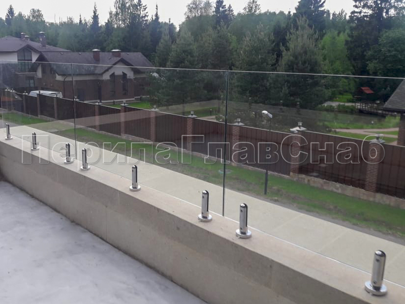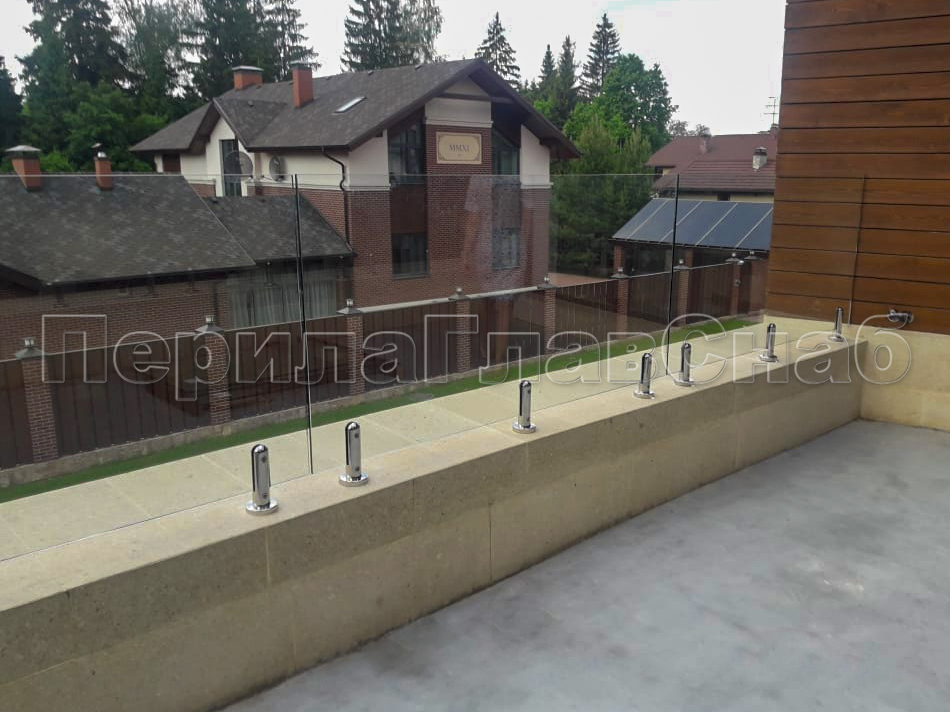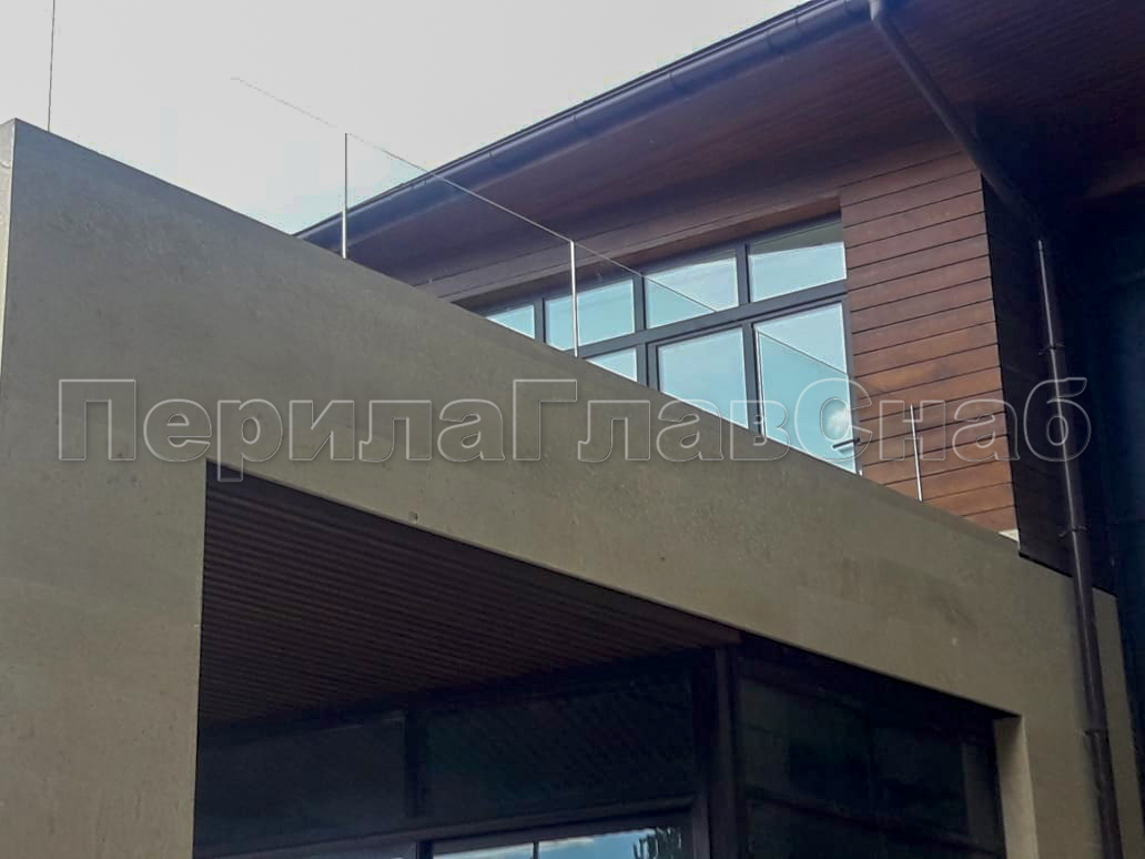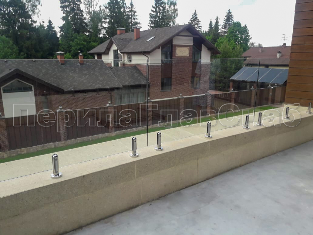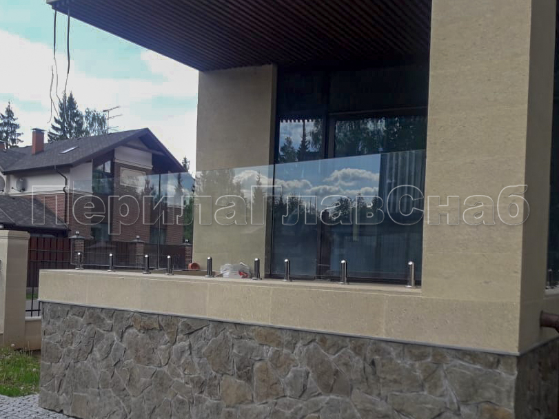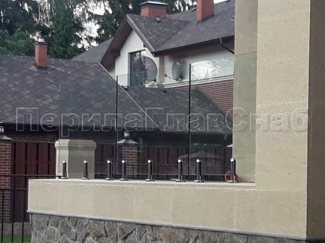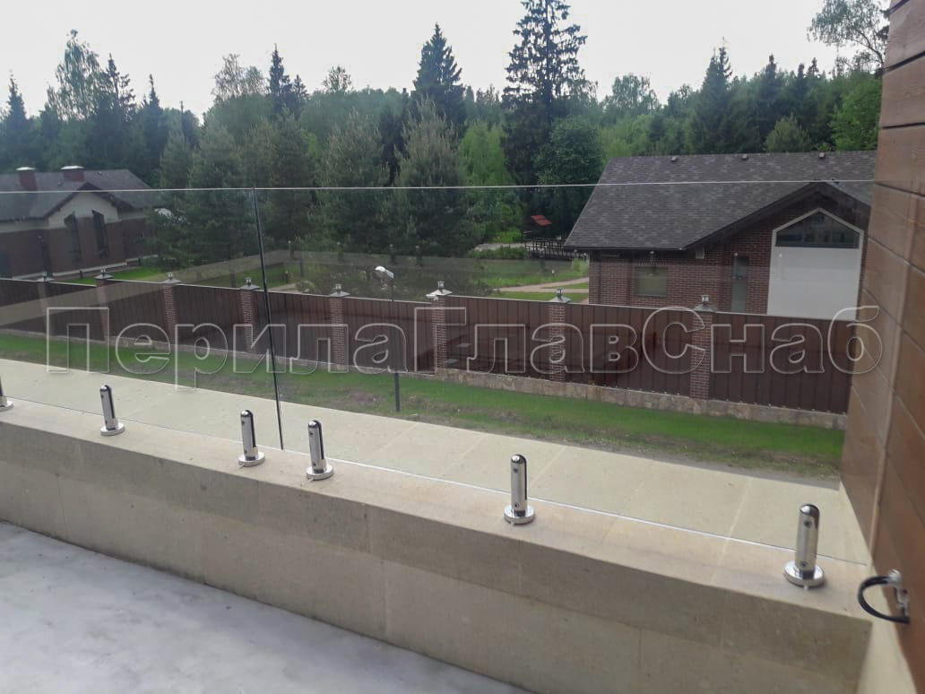 Клиент выбрал это элитное ограждение что-бы кардинально отличаться от других домов в своем поселке. При отделке фасада использовались и сочетались самые современные разноплановые материалы: дерево, камень, штукатурка, такого же подхода требовал и выбор перил. Наличие многочисленных балконов и террас требовало максимальной легкости и прозрачности конструкции ограждения, что бы любоваться замечательным видом на примыкающий лес. С функциональной точки зрения ветрозащита при таком конструктиве обеспечена на должном уровне. Минимальные зазоры между нижней кромкой стекла и полом делают уборку террас и балконов от листьев, воды и снега очень легкой и удобной. Напольные стеклодержатели собственного дизайна и производства компании ПерилаГлавСнаб имелись на складе в достаточном количестве. Это позволило реализовать проект в кратчайшие сроки. Данный тип крепления стекла выполнен из полированной нержавеющей стали AISI 304 для наружных работ. Грамотный измерительный процесс позволил согласовать проект с учетом пожеланий заказчика и быстро запустить процесс изготовления закаленного стекла. В местах крепления в стекле предусмотрены специальные отверстия для сквозного крепежа. Это обеспечивает дополнительную безопасность и уверенность казалось-бы на первый взгляд в хрупкой конструкции стеклянного ограждения. Из сорока шести метров ограждения были два участка по три метра установлены из единого стеклянного полотна по желанию заказчика. Что-бы воплотить в жизнь такое конструктивное решение пришлось прибегнуть к использованию манипуляторного крана, потому что стекла такой длины не представлялось возможным пронести через дверные проемы дома. Заказчик ровным счетом как и мы остались довольны полученным результатам, красивые фотографии говорят сами за себя.