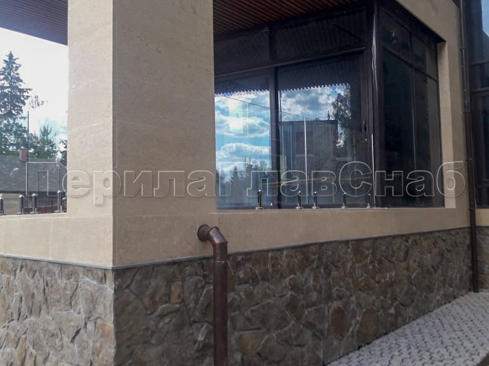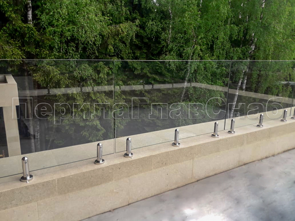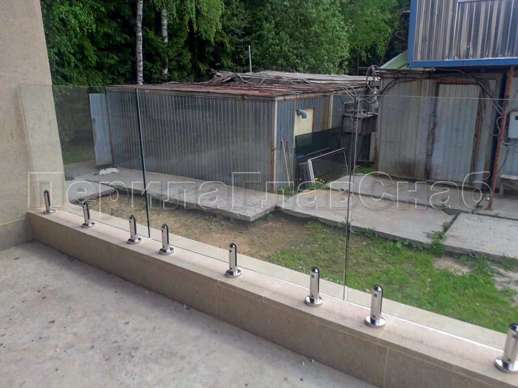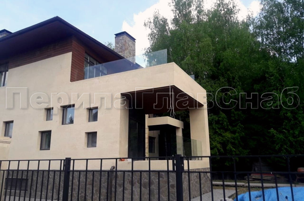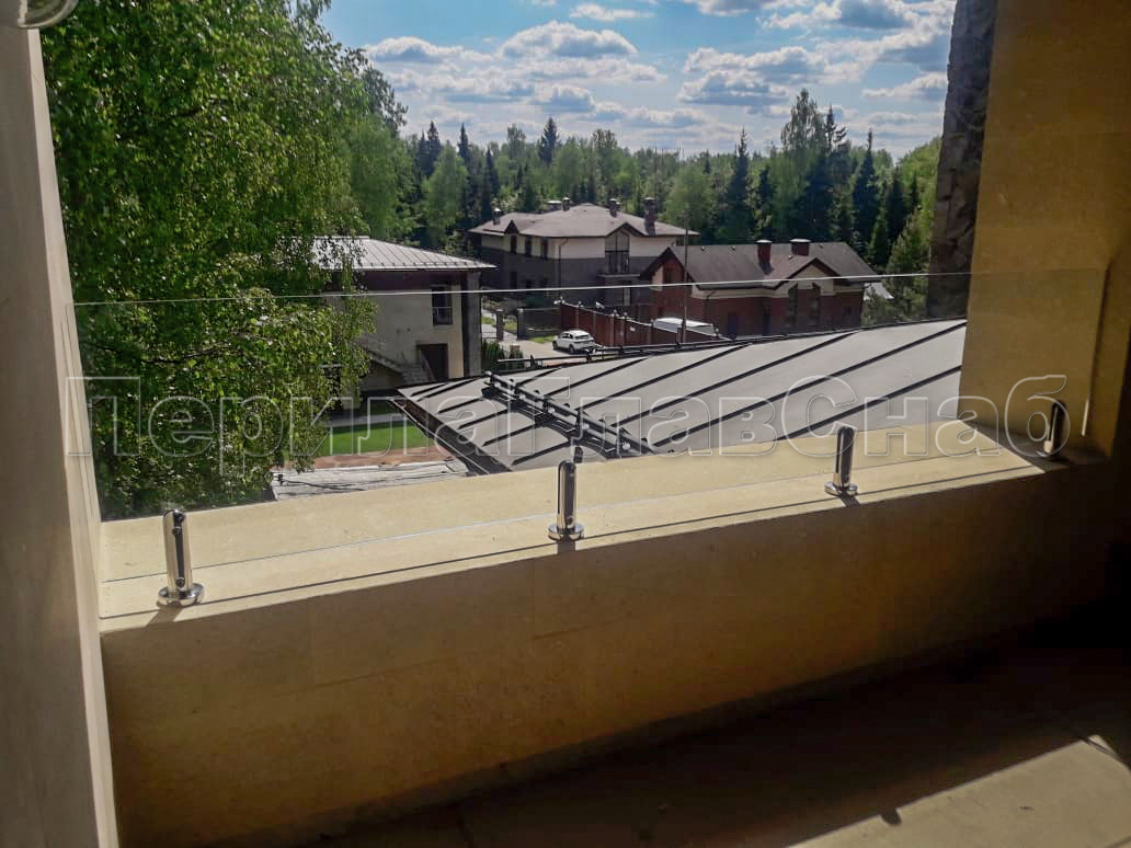 Клиент выбрал это элитное ограждение что-бы кардинально отличаться от других домов в своем поселке. При отделке фасада использовались и сочетались самые современные разноплановые материалы: дерево, камень, штукатурка, такого же подхода требовал и выбор перил. Наличие многочисленных балконов и террас требовало максимальной легкости и прозрачности конструкции ограждения, что бы любоваться замечательным видом на примыкающий лес. С функциональной точки зрения ветрозащита при таком конструктиве обеспечена на должном уровне. Минимальные зазоры между нижней кромкой стекла и полом делают уборку террас и балконов от листьев, воды и снега очень легкой и удобной. Напольные стеклодержатели собственного дизайна и производства компании ПерилаГлавСнаб имелись на складе в достаточном количестве. Это позволило реализовать проект в кратчайшие сроки. Данный тип крепления стекла выполнен из полированной нержавеющей стали AISI 304 для наружных работ. Грамотный измерительный процесс позволил согласовать проект с учетом пожеланий заказчика и быстро запустить процесс изготовления закаленного стекла. В местах крепления в стекле предусмотрены специальные отверстия для сквозного крепежа. Это обеспечивает дополнительную безопасность и уверенность казалось-бы на первый взгляд в хрупкой конструкции стеклянного ограждения. Из сорока шести метров ограждения были два участка по три метра установлены из единого стеклянного полотна по желанию заказчика. Что-бы воплотить в жизнь такое конструктивное решение пришлось прибегнуть к использованию манипуляторного крана, потому что стекла такой длины не представлялось возможным пронести через дверные проемы дома. Заказчик ровным счетом как и мы остались довольны полученным результатам, красивые фотографии говорят сами за себя.
