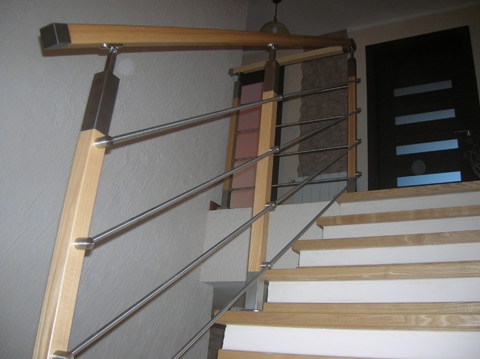 Три ригеля на сварке, квадратный деревянный поручень и круглые стойки