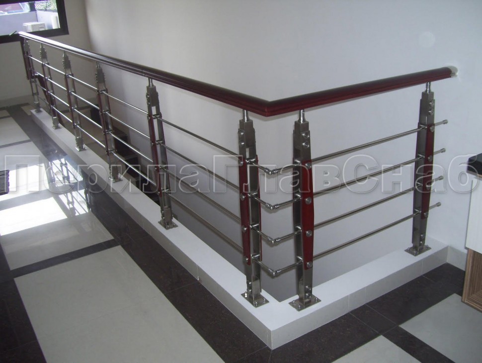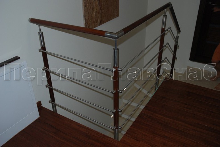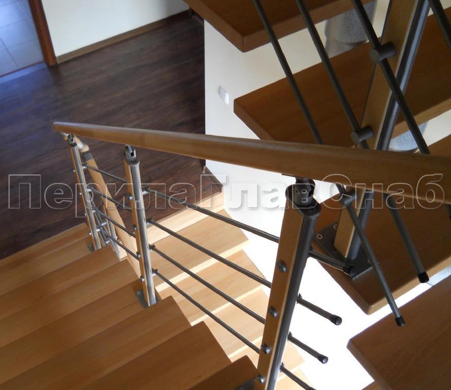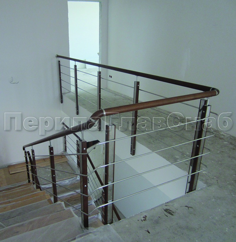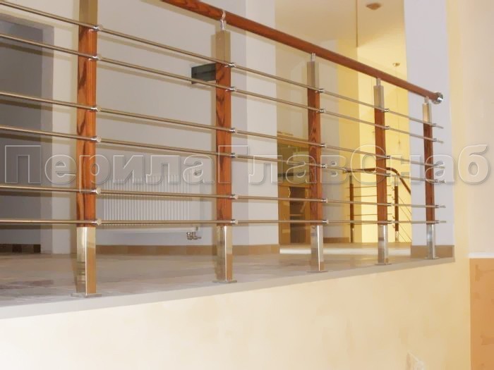 Четыре ригеля на держателях, круглый деревянный поручень и квадратные стойки