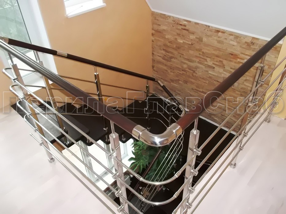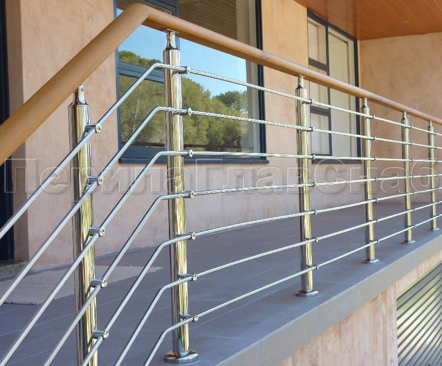 Нержавеющие ограждения без ригелей с круглым поручнем и стойками с деревянными вставками