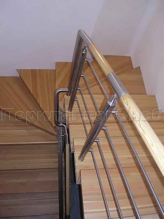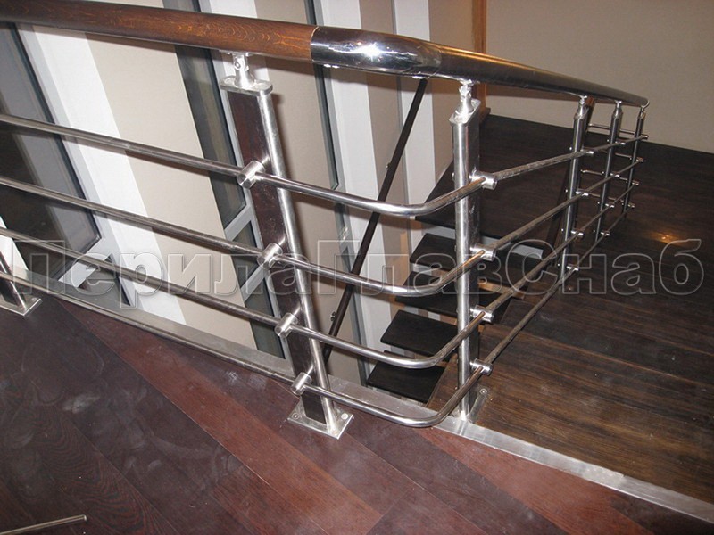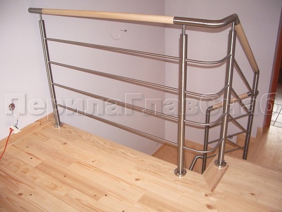 Три ригеля на сварке, квадратный деревянный поручень и круглые стойки