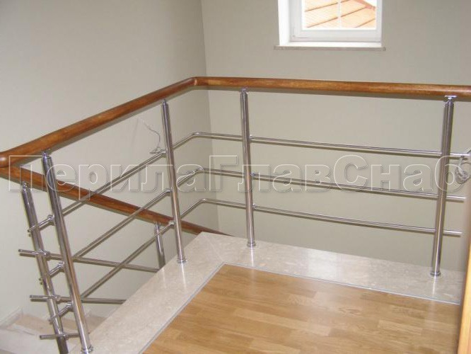 Три ригеля на сварке, квадратный деревянный поручень и круглые стойки