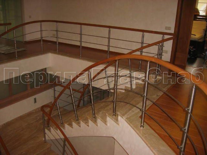 Нержавеющие ограждения без ригелей с круглым деревянным поручнем и стойками с деревянными вставками