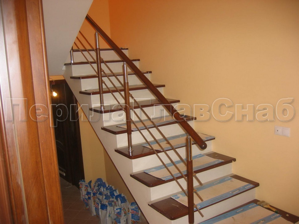 Ограждения с двумя стойками в каждую ступень с деревянным поручнем и без ригелей