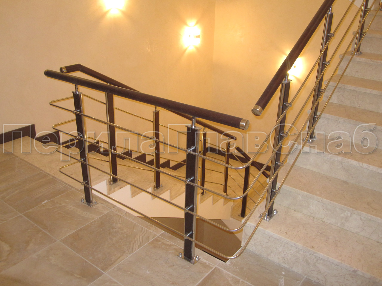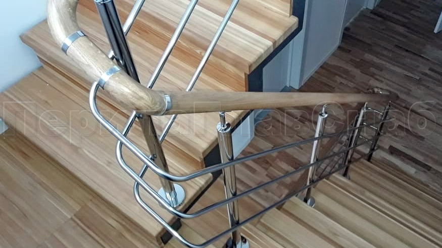 Нержавеющие ограждения без ригелей с круглым деревянным поручнем и стойками с деревянными вставками в Красноярске. Готовые проекты ПерилаГлавСнаб - фото 1
