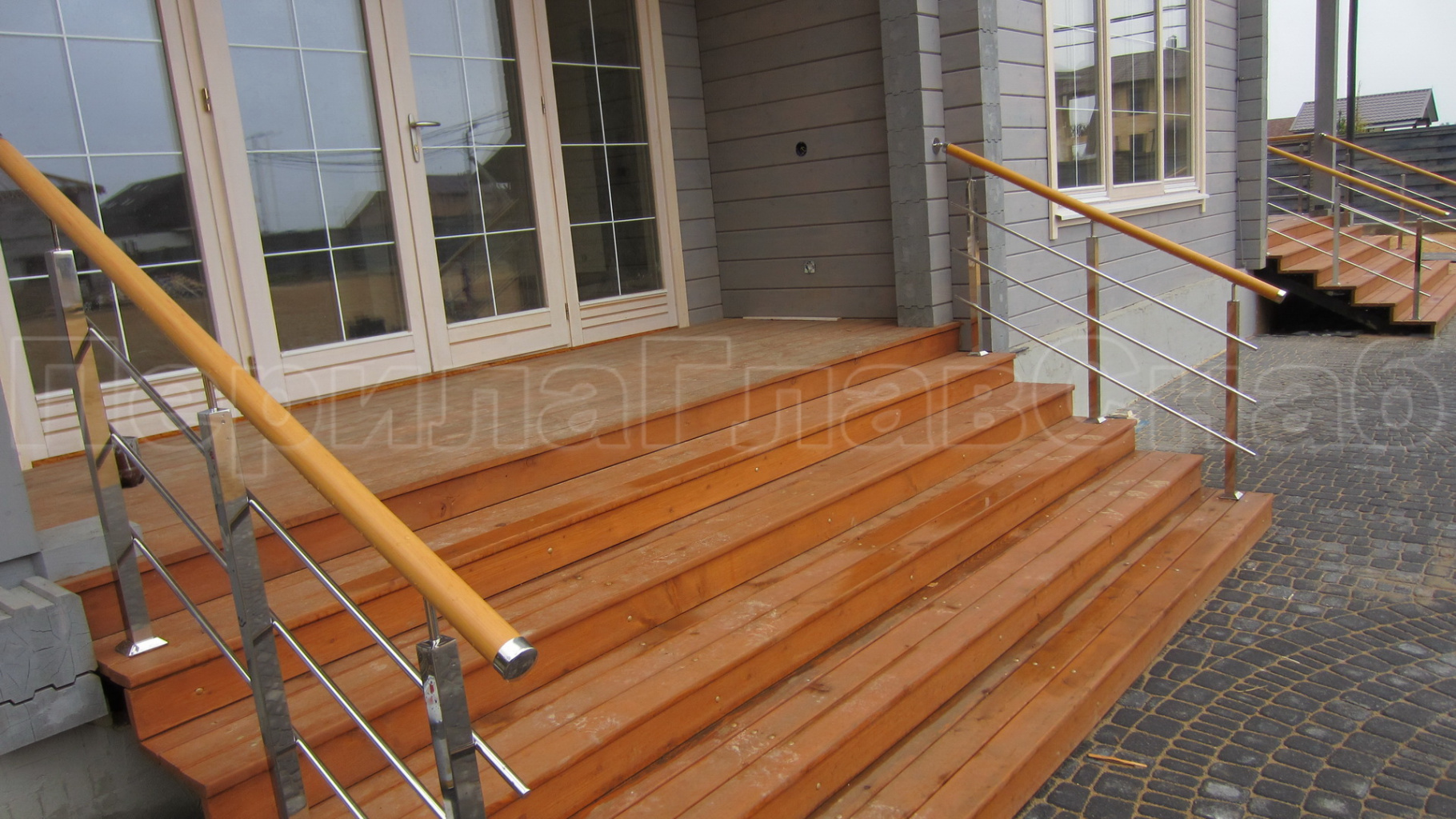 Нержавеющие ограждения без ригелей с круглым деревянным поручнем и стойками с деревянными вставками в Красноярске. Готовые проекты ПерилаГлавСнаб