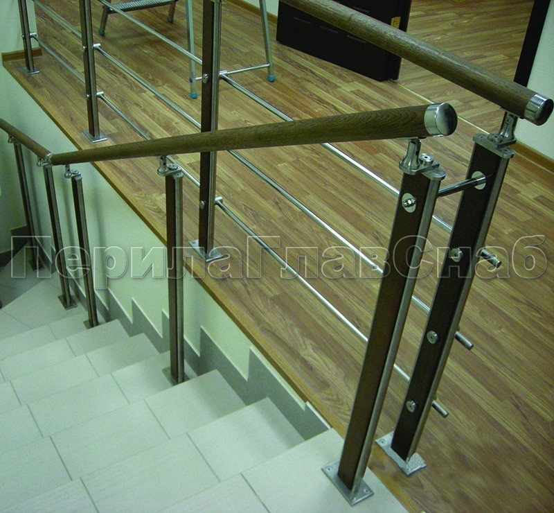 Четыре ригеля на держателях, квадратный деревянный поручень и квадратные стойки