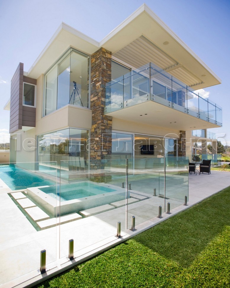 Ограждение с деревянным поручнем на точечном креплении