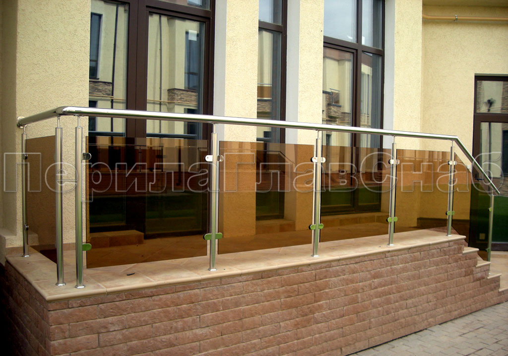 Ограждение для лестницы из нержавейки с зажимными стеклодержателями для крыльца в Красноярске. Готовые проекты ПерилаГлавСнаб