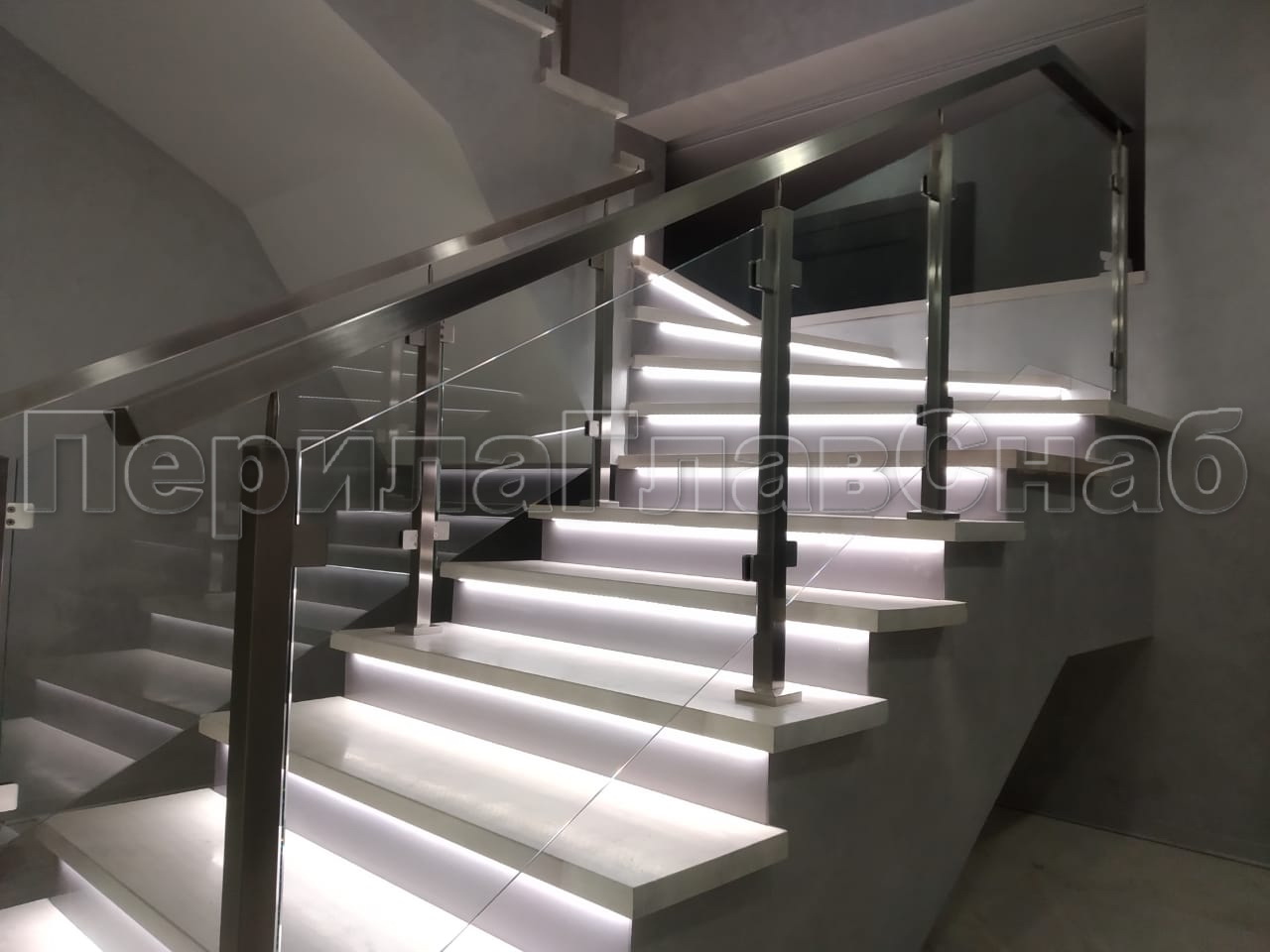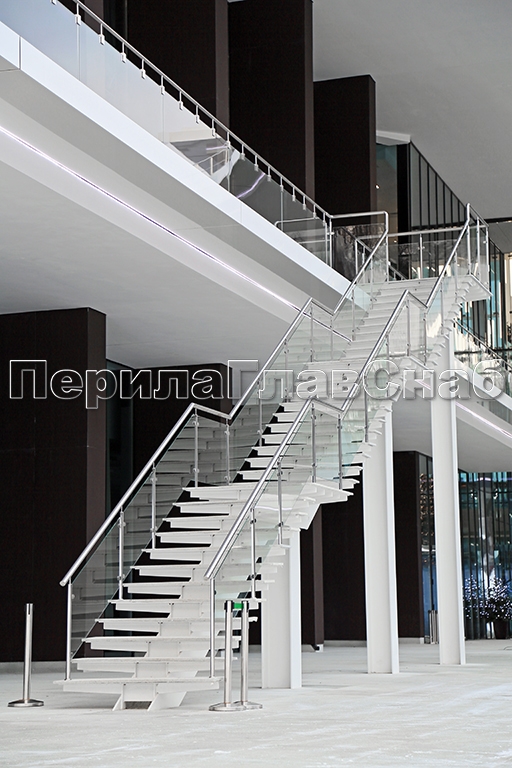 Ограждения лестницы без поручня с зажимными стеклодержателями и стойками в Красноярске. Готовые проекты ПерилаГлавСнаб