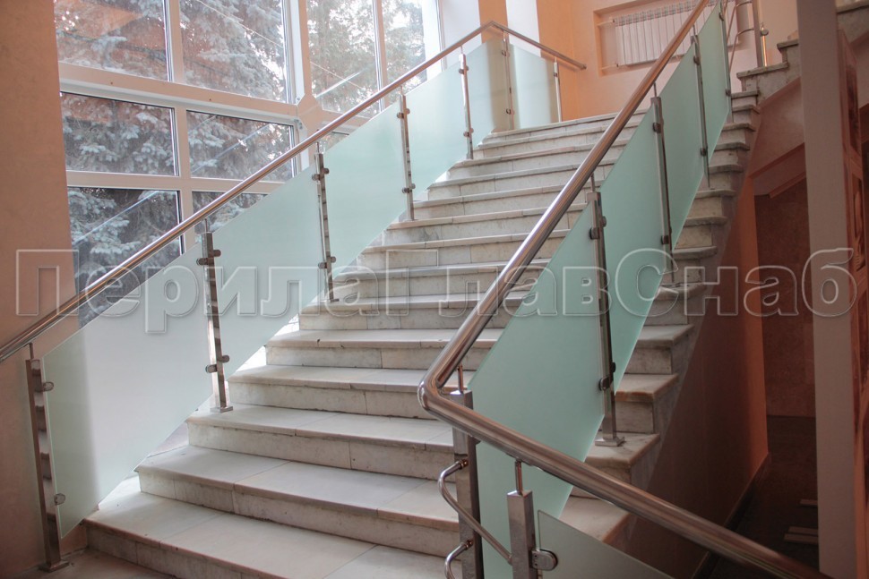 Можно выбрать ограждение из нержавейки с зажимными стеклодержателями.