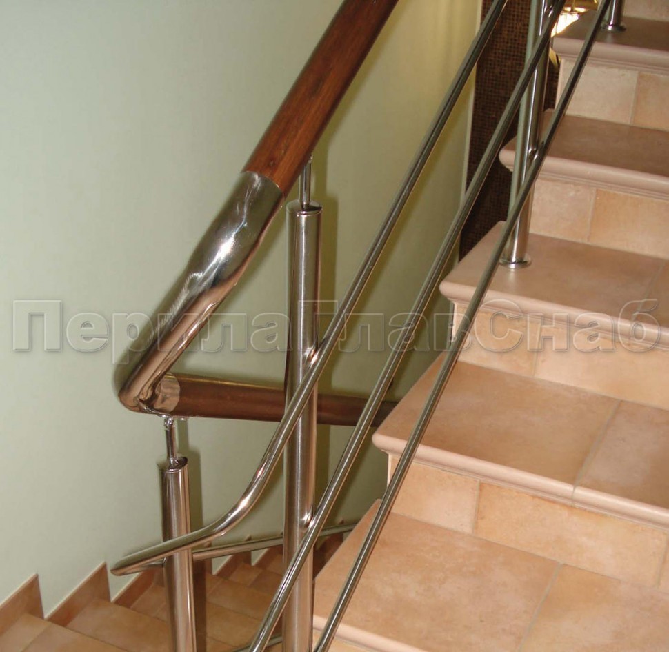 Нержавеющие ограждения без ригелей с круглым поручнем и стойками с деревянными вставками