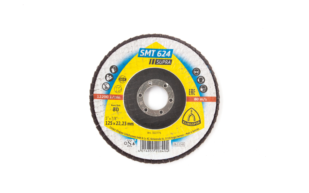 Ф-1139 Шлиф. диск "лепесток" 125х22 Р-80 Клиншпор. Модель SMT624 лепесткового торцевого круга диаметром 125 мм соответствует высшим критериям качества, производительности и безопасности при обработке кромки и зачистке сварного шва изделий из нержавеющей стали.