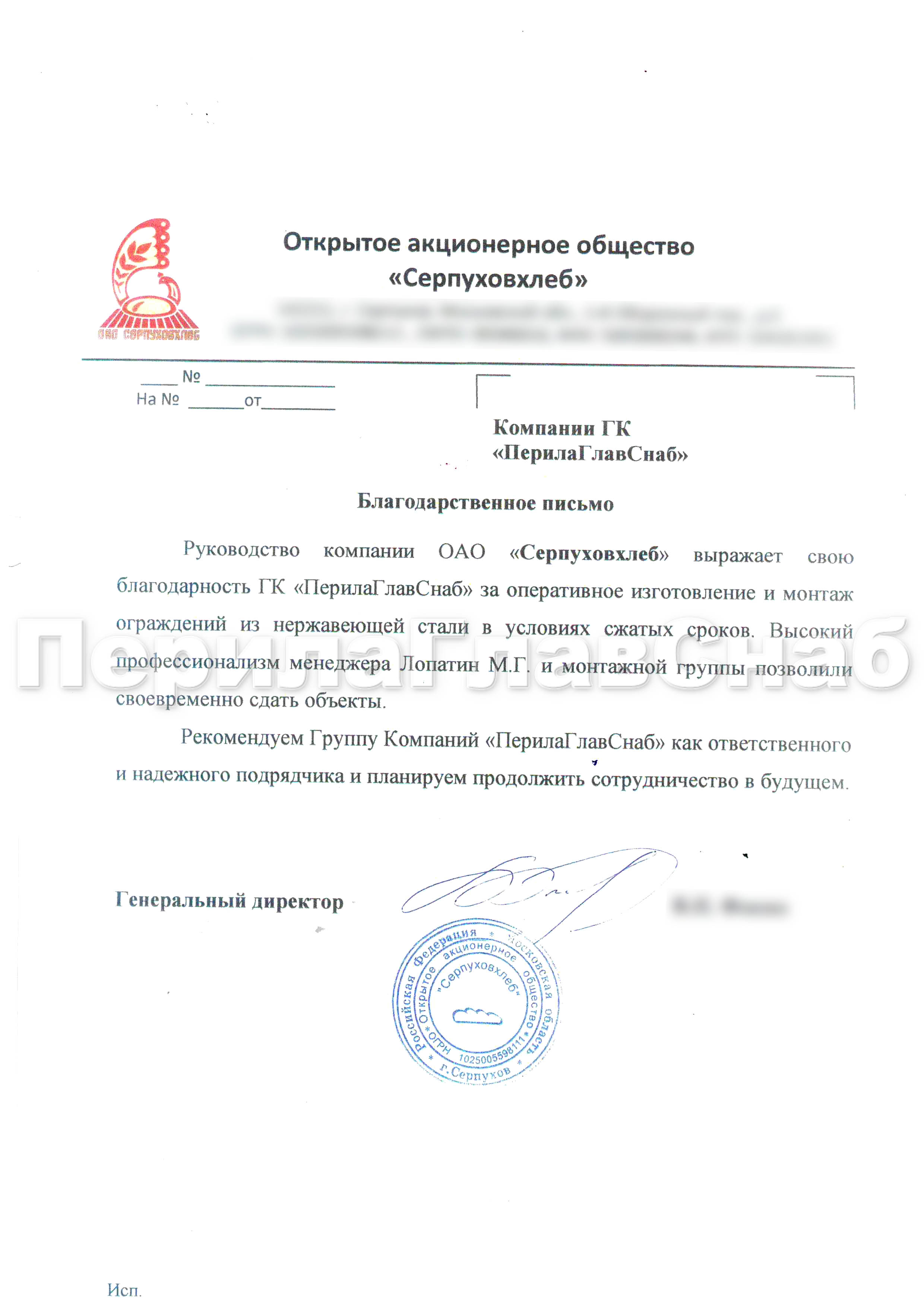 Руководство компании ОАО "Серпуховхлеб" выражает свою благодарность ГК "ПерилаГлавСнаб" за оперативное изготовление и монтаж ограждений из нержавеющий стали в условиях сжатых сроков. Высокий профессионализм менеджера Лопатина М.Г. и монтажной группы позволили своевременно сдать объекты.