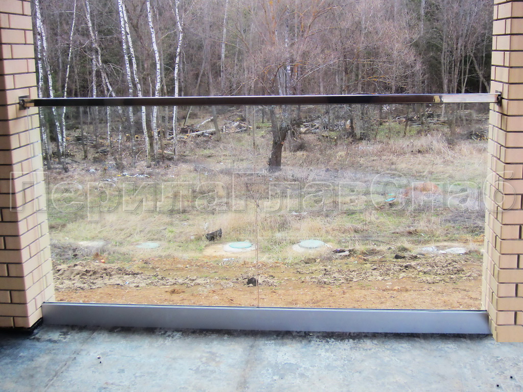 Стеклянное ограждение для балкона без стоек. Крепление на точках. Поручень - труба с пазом.