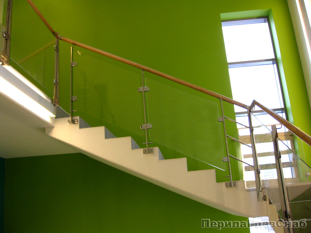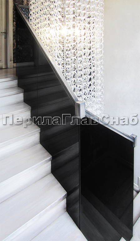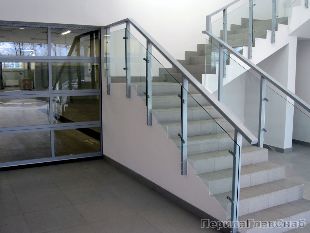 Ограждение лестницы с квадратными стойками и пластинчатыми стеклодержателями в Красноярске. Готовые проекты ПерилаГлавСнаб