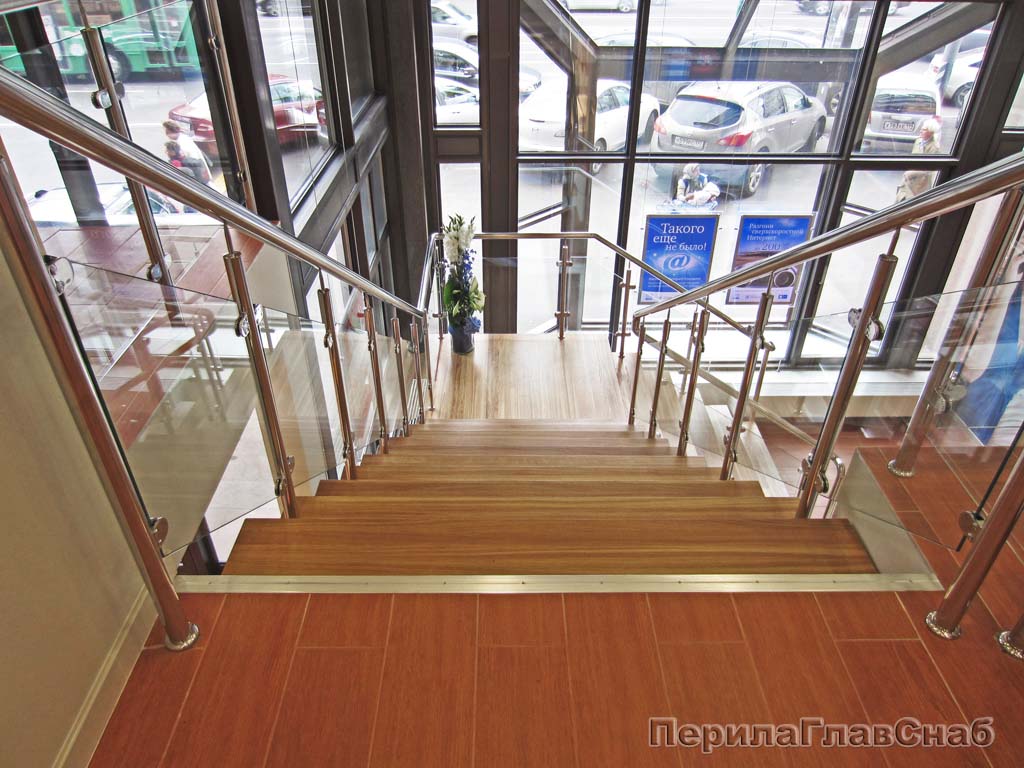 Ограждение для лестницы из нержавейки с зажимными стеклодержателями для крыльца в Красноярске. Готовые проекты ПерилаГлавСнаб
