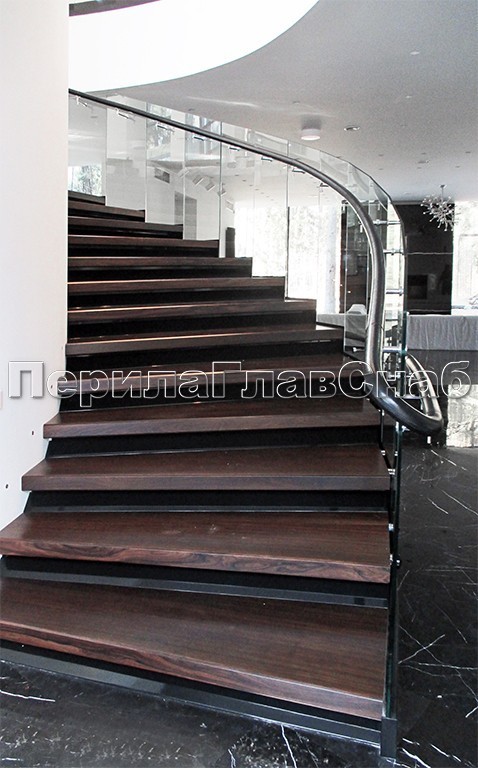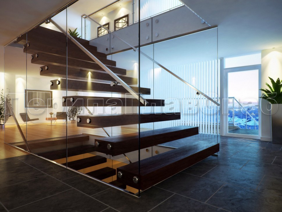 Ограждение с деревянным поручнем на выносе на точечном креплении на лестнице