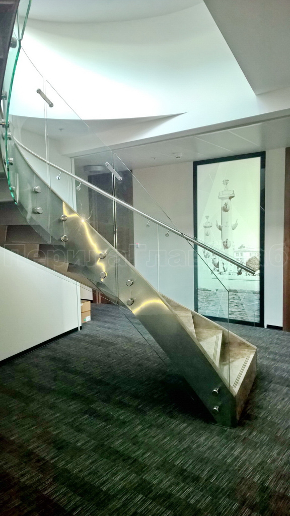 Ограждения лестниц на несущем стекле с подсветкой в Красноярске. Готовые проекты ПерилаГлавСнаб