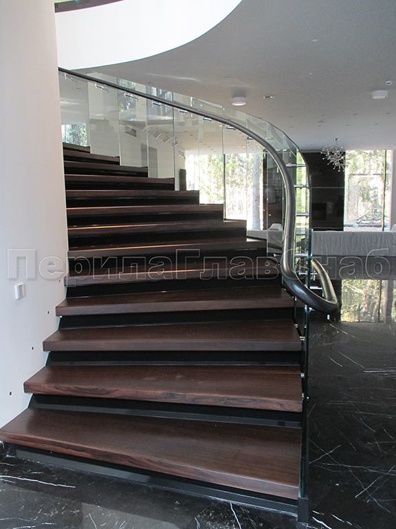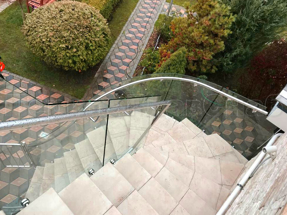 Цельностеклянные ограждения для забежных лестниц с обработкой стекла - фаска.