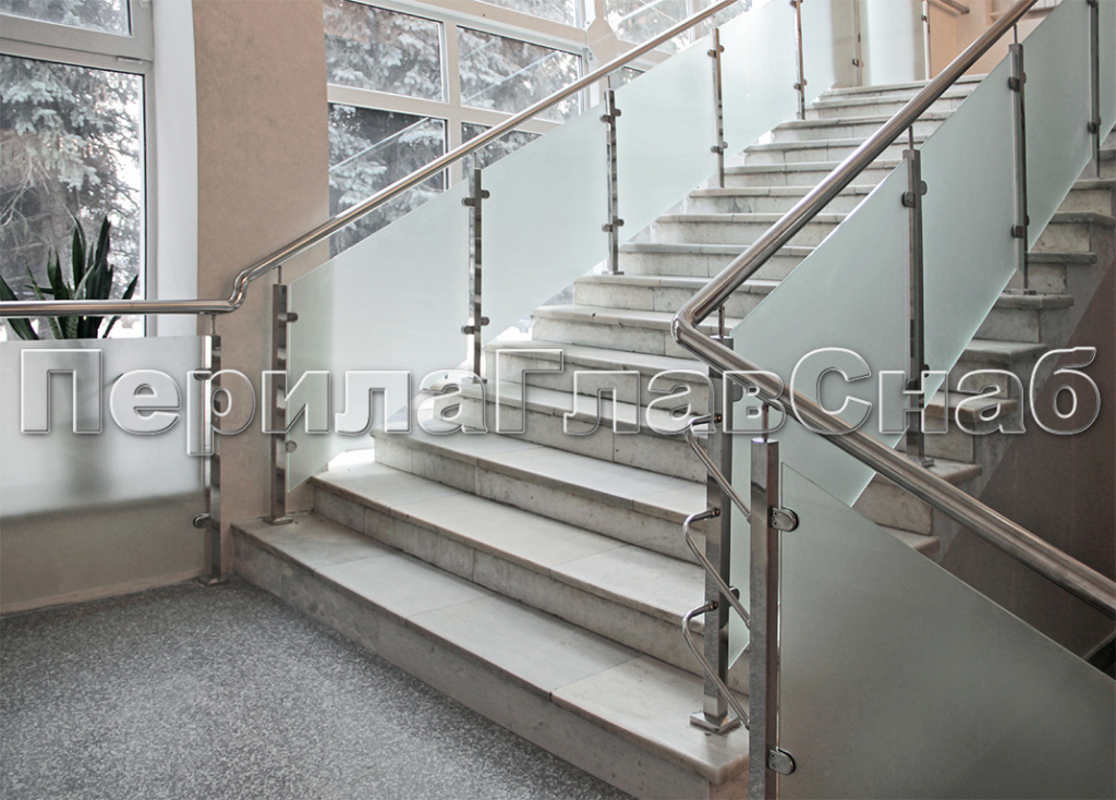 Ограждение для лестницы из нержавейки с зажимными стеклодержателями для крыльца в Красноярске. Готовые проекты ПерилаГлавСнаб