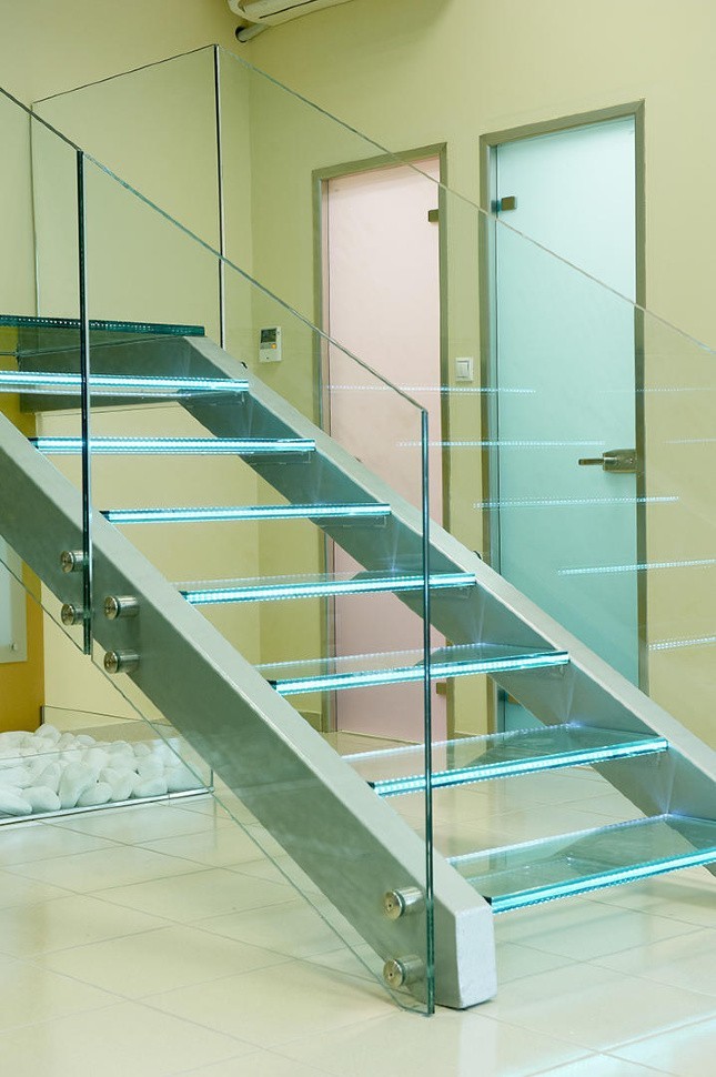 Стеклянные ступени на косоурной лестнице в доме