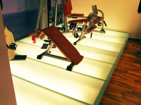 Стеклянные полы с подсветкой. На фотографиях стеклянного пола видно, что может быть либо встроена под прозрачные плиты. Этот способ используется если пол изготавливается как элемент декора и не выполняет функции перекрытия. Такой прием можно использовать для стеклянные потолков или полов например на кухне или в спорт зале или в гостиной (ваша гостья будет приятно удивлена вечером такой иллюминации пола). Если же стеклянная плита или стеклянные блоки я вляются межэтажным перекрытием, то для подсветки стекла используются светодиоды и они встраиваются в торцы стеклянных блоков. Для подсветки стеклянных ступеней или стеклянных межмаршевых площадок используется светодиодная лента.