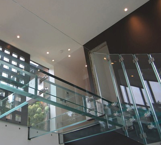 Стеклянные ступени и стеклянная площадка на лестнице
