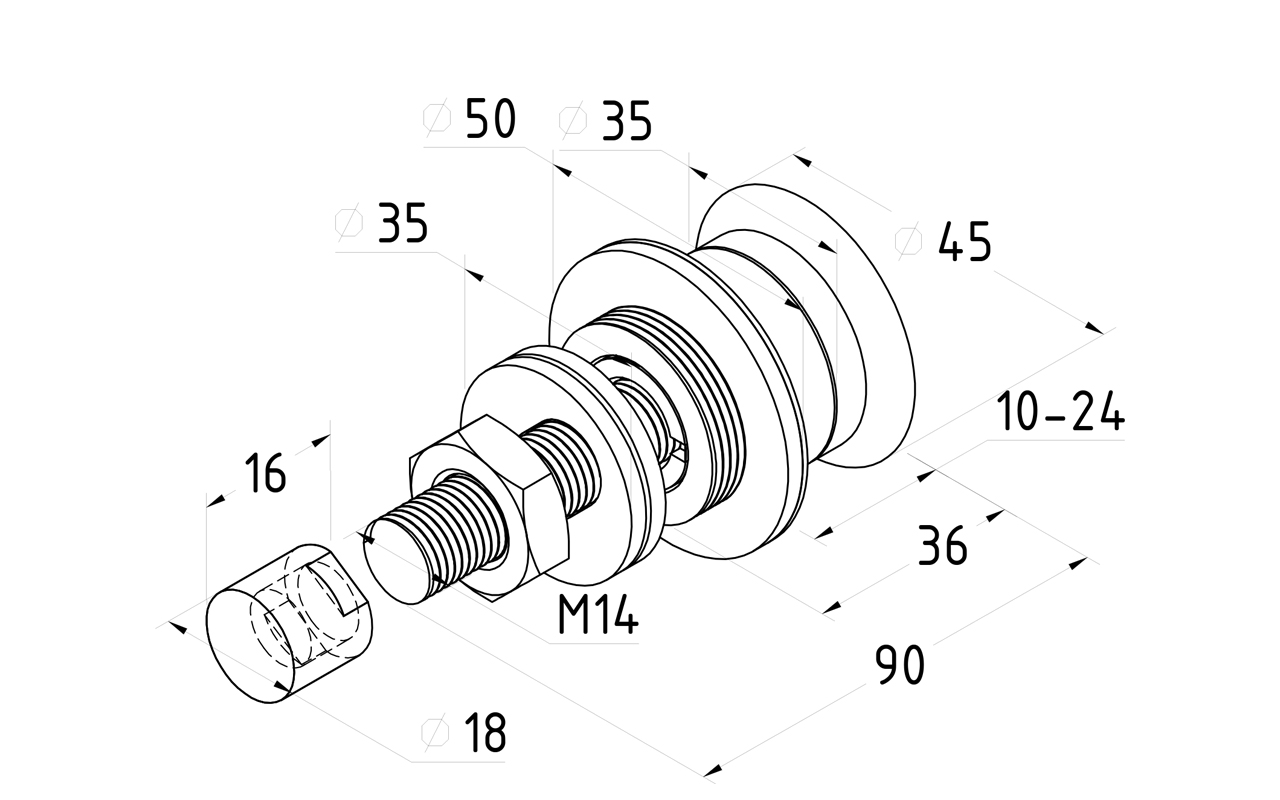 В современном мире все чаще используют стеклянные ограждения, и они стали неотъемлемой частью современного города. При создании своих проектов, архитекторы прибегают к конструкциям из стекла, таким как: стеклянные ограждения, стеклянные козырьки, остекление фасадов, остекления крыш и т.п. Стекло не коррозирует, устойчиво к химическим веществам в отличие от металла. При монтаже стекла следует тщательно выбрать крепеж, ведь от этого зависит прочность и внешний вид конструкции. Для улицы и помещения стоит выбирать разные крепежи в связи с разным воздействием внешних факторов. Так для помещения подойдет нержавеющая сталь AISI 201, а для внешних конструкций нужно использовать нержавеющую сталь AISI 304. На конструкции, расположенные на улице воздействуют перепады температур, ветер, солнечный свет и тому подобные. При монтаже куполов, фасадного остекления, ограждений на несущем стекле важна не только прочность самого материала, а еще и точность расчета и монтажа изделия. Стоит учитывать вес конструкций, надежность напрямую зависит от металлического каркаса. Установку стеклянных козырьков, остекление крыш, фасадного вертикального остекления, остекление навесных конструкций и спайдерного остекления, невозможно представить без рутеля. Он надежно фиксирует стекло. Рутель изготовлен из нержавеющей стали AISI 304, что позволяет использовать его на улице. При использовании рутеля с зенковкой нужна высокая точность в процессе обработки отверстия и его центровки при изготовлении стекла. В то же время за счет конусного стеклодержателя рутеля Вы можете достичь гладкой поверхности с внешней стороны стекла. Размер шпильки рутеля: M14, толщина стекла от 8 до 24 мм. Благодаря высокой прочности рутель выдерживает нагрузки до 300 килограмм.